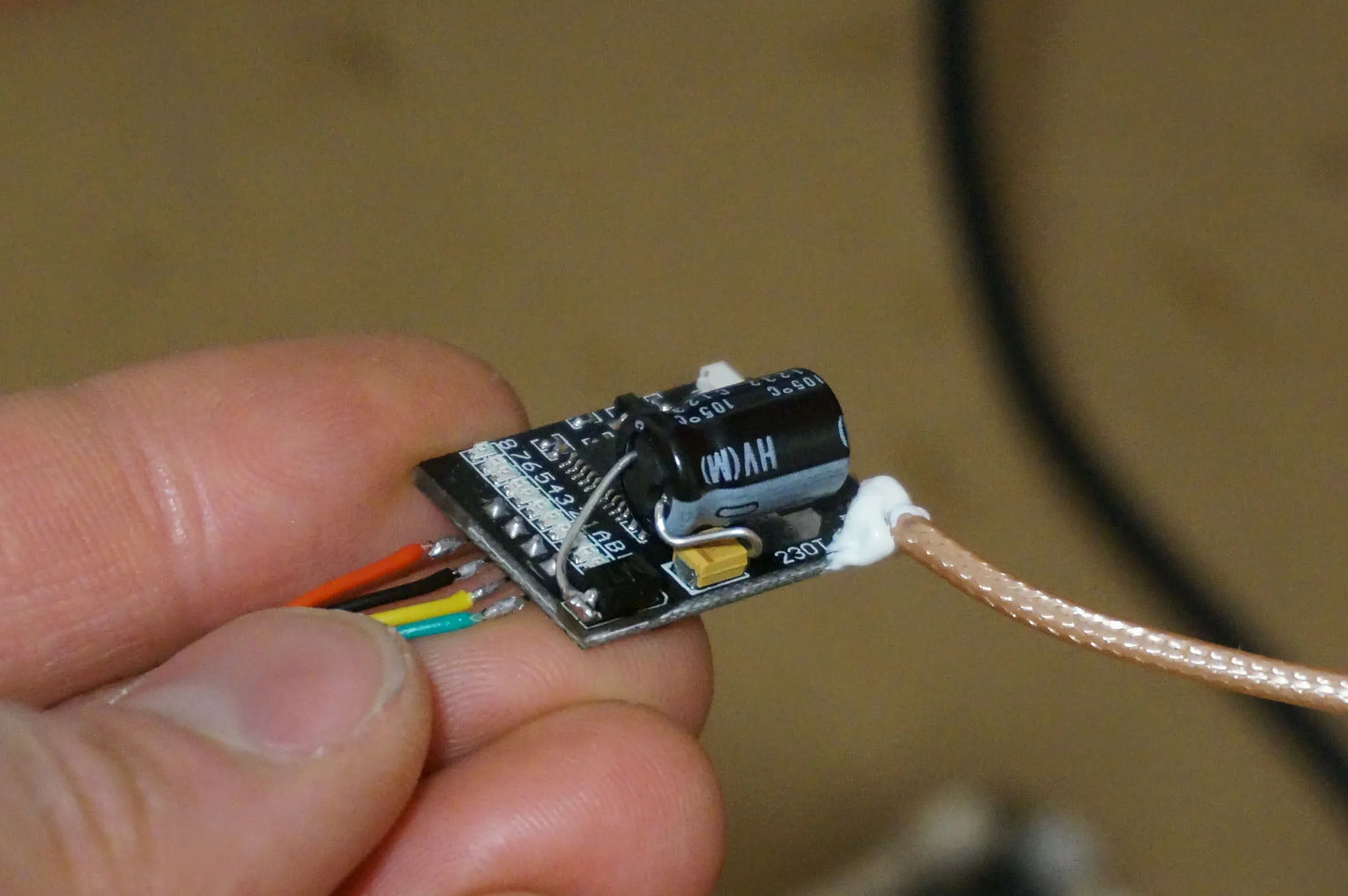 You’ll notice I’m wiring the camera cable right to the VTX, skipping the PCB, this is so I can better position the VTX on the tiny frame.