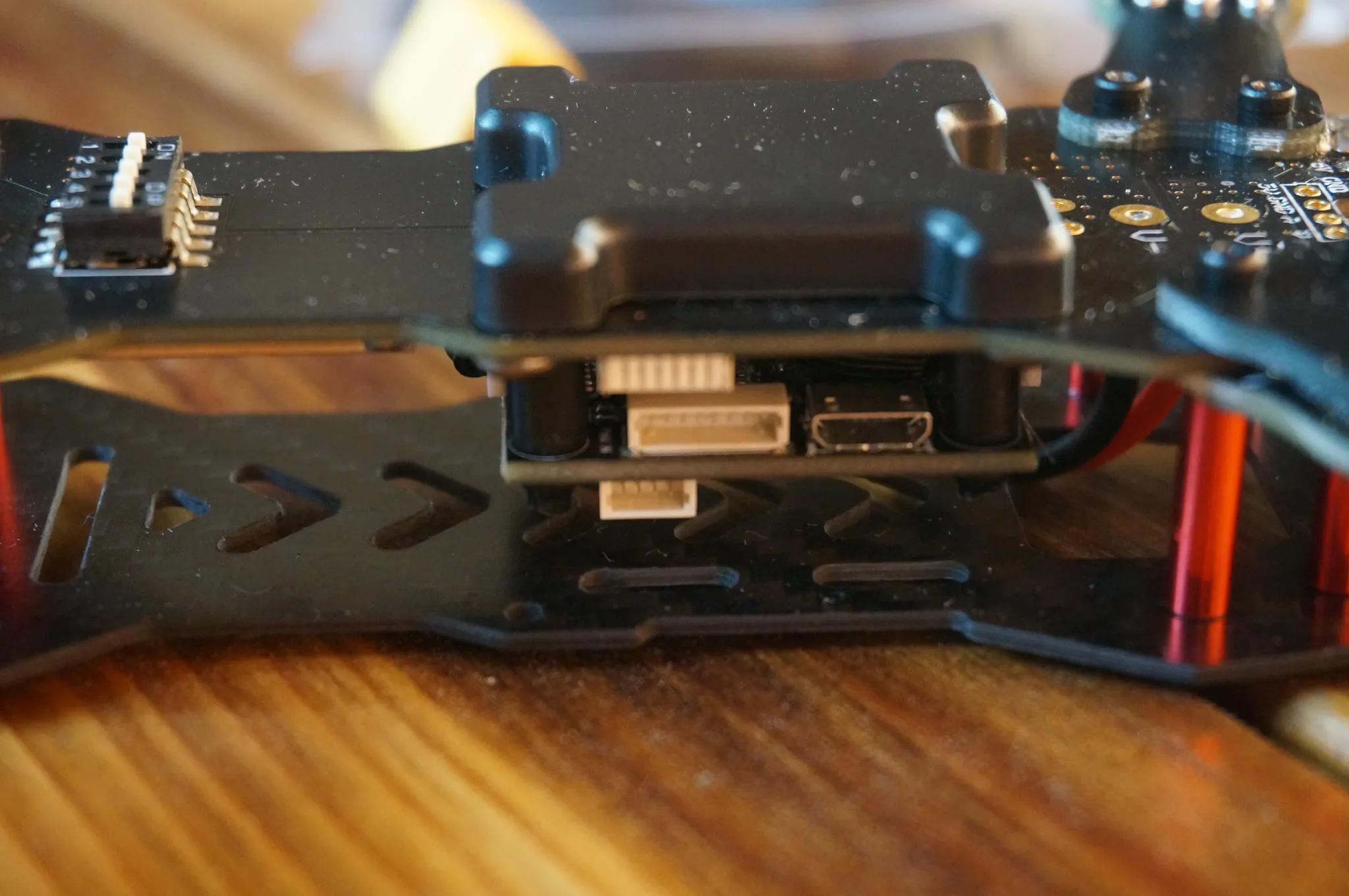 DIP switches to change the video transmitter channels are on the top, which is convenient. There is a standard micro USB port on the other side of the flight controller.