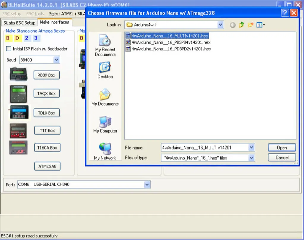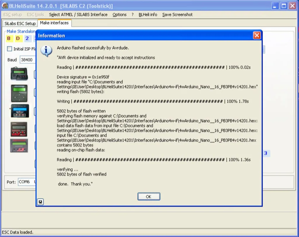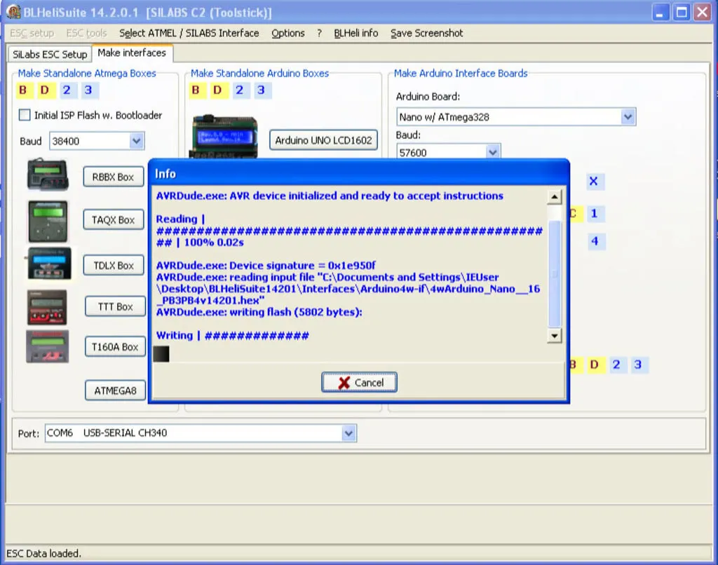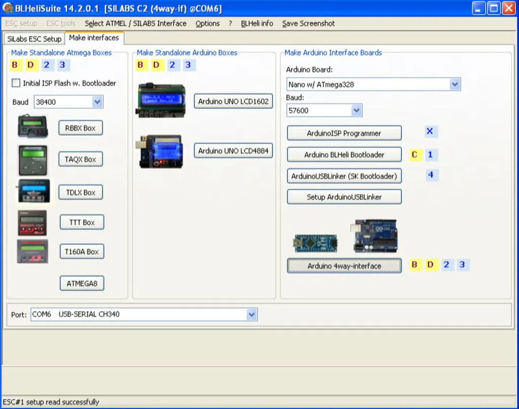 Open the Make Interfaces tab, pick the Arduino Board: Nano W/ ATmega328 choose your COM port and click “Arduino 4way-interface”