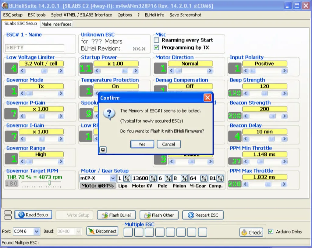 Once your ESC is plugged in, hit “Connect” then “Read Setup,” you should get a prompt like this, to flash BlHeli.