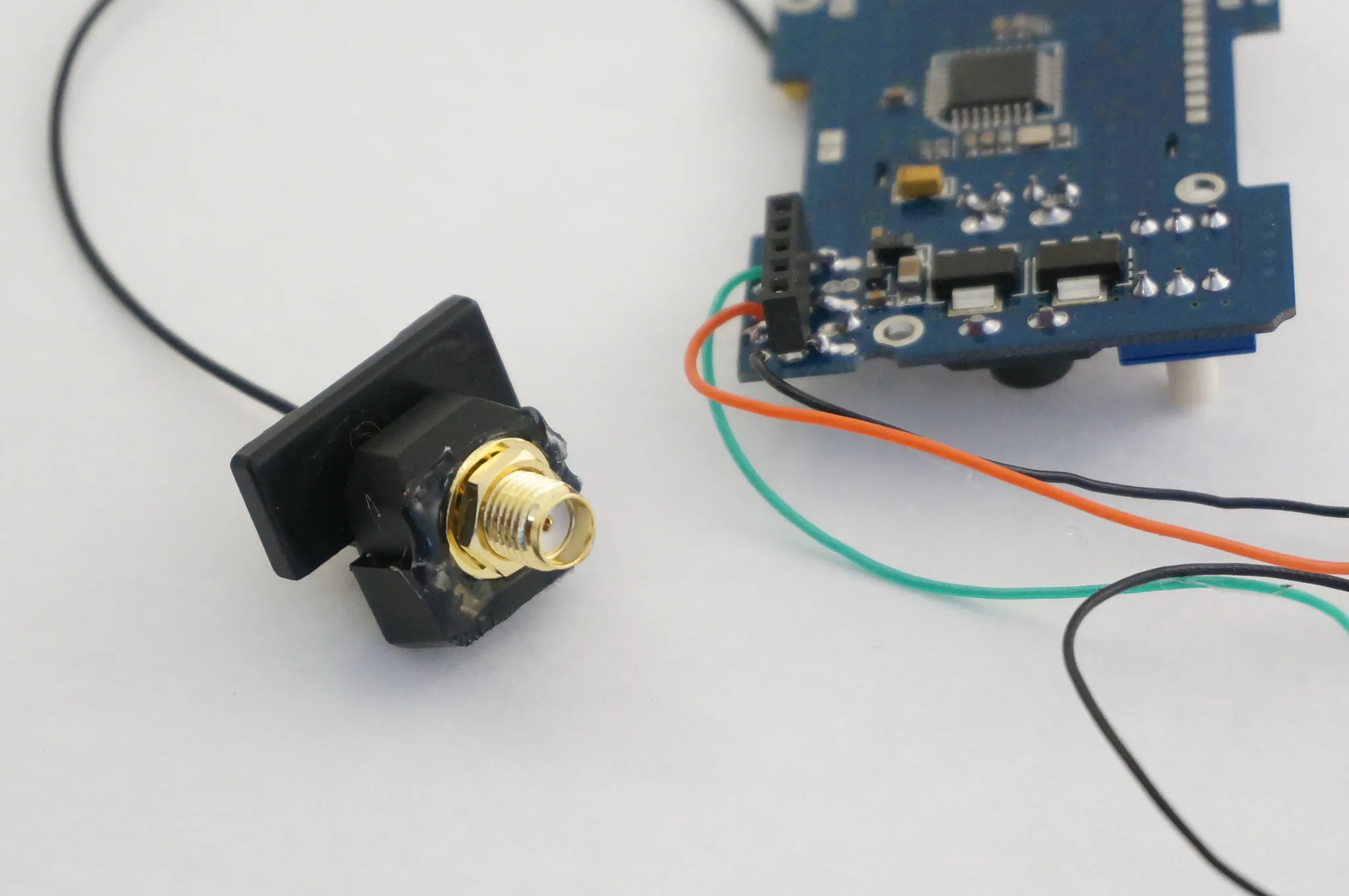 Once you’ve got that opened enough, the SMA adapter should fit nicely and can be secured with some hot glue.