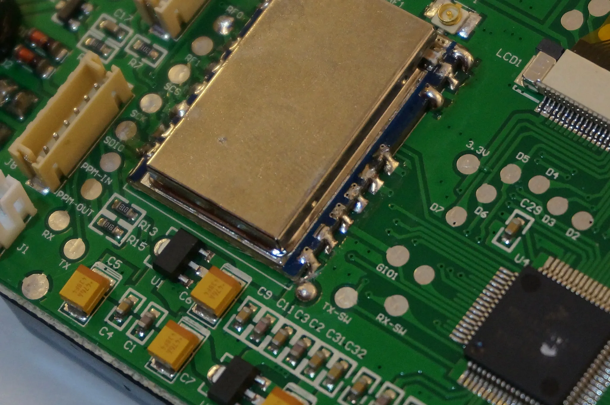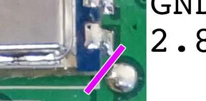 We need to cut the power line between the PCB and the radio module. Right here.