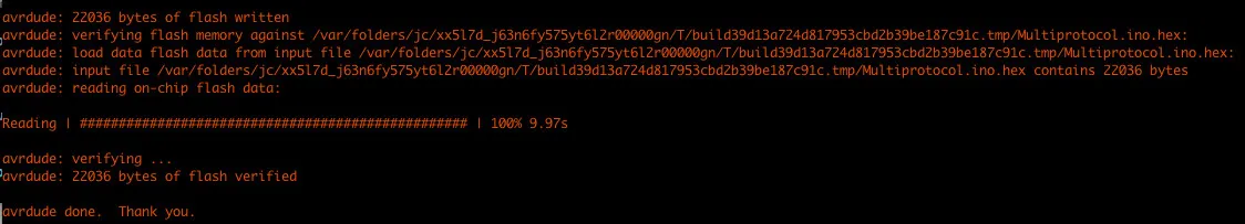 avrdude: verifying flash memory against /var/folders/jc/xx5l7d_j63n6fy575yt6l2r00000gn/T/build39d13a724d817953cbd2b39be187c91c.tmp/Multiprotocol.ino.hex:
