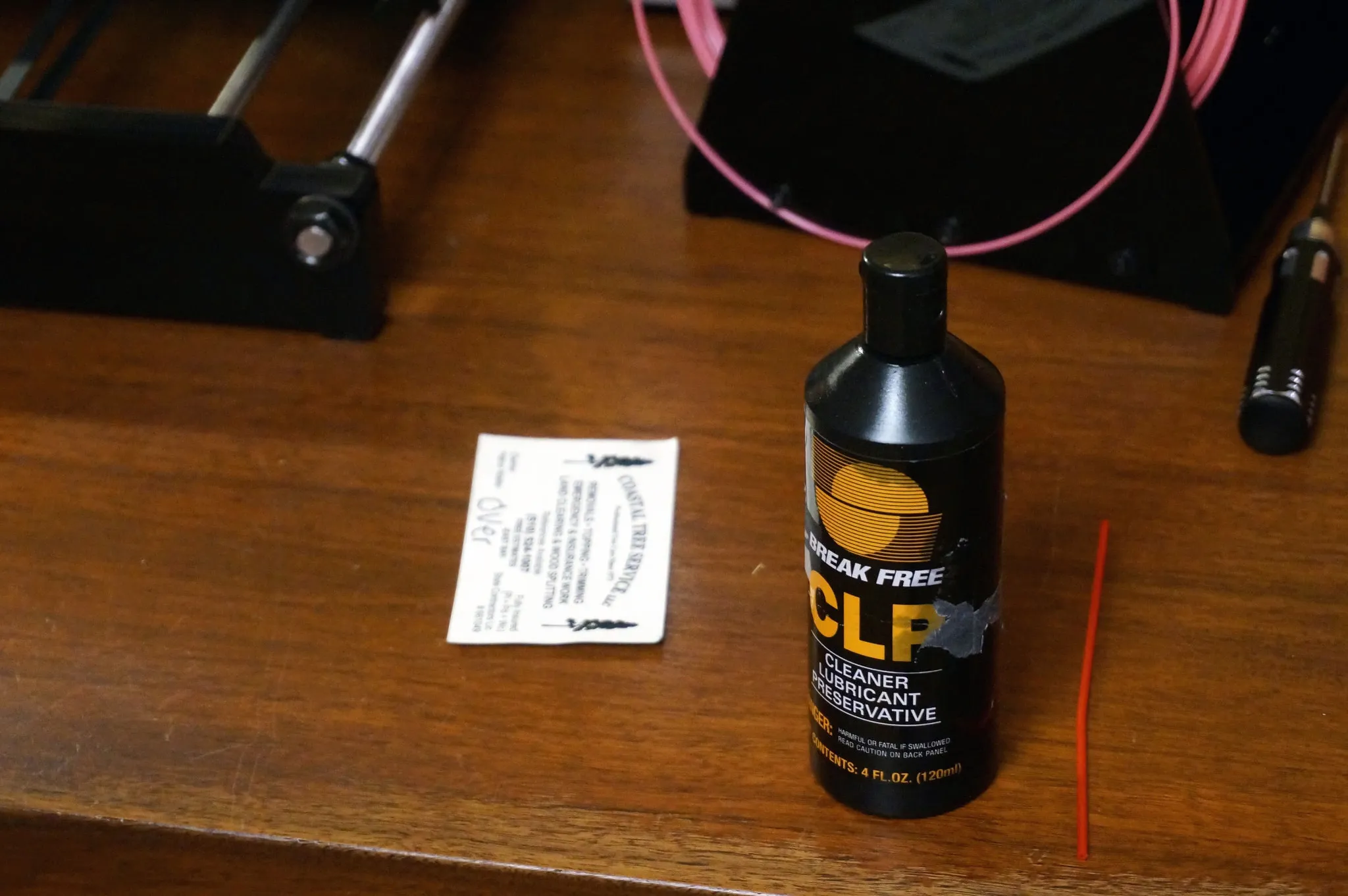 The first thing to calibrate is the belt tension. We want it as tight as possible, but not too tight such that the axis binds (e.g. can’t move). Start by lubricating all the bearings and linear rods by covering them with a PTFE lubricant and moving them to every extreme. I used CLP Breakfree:
