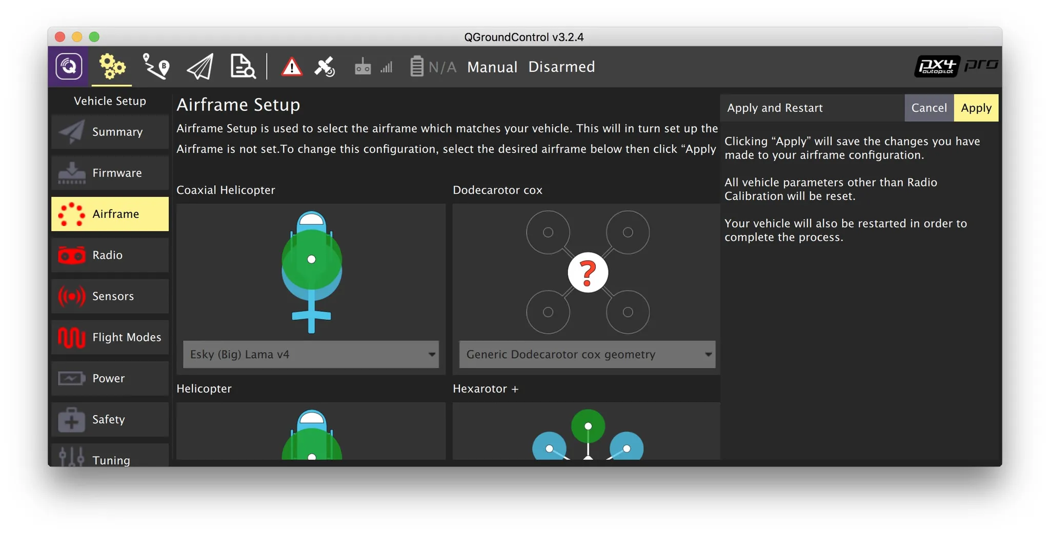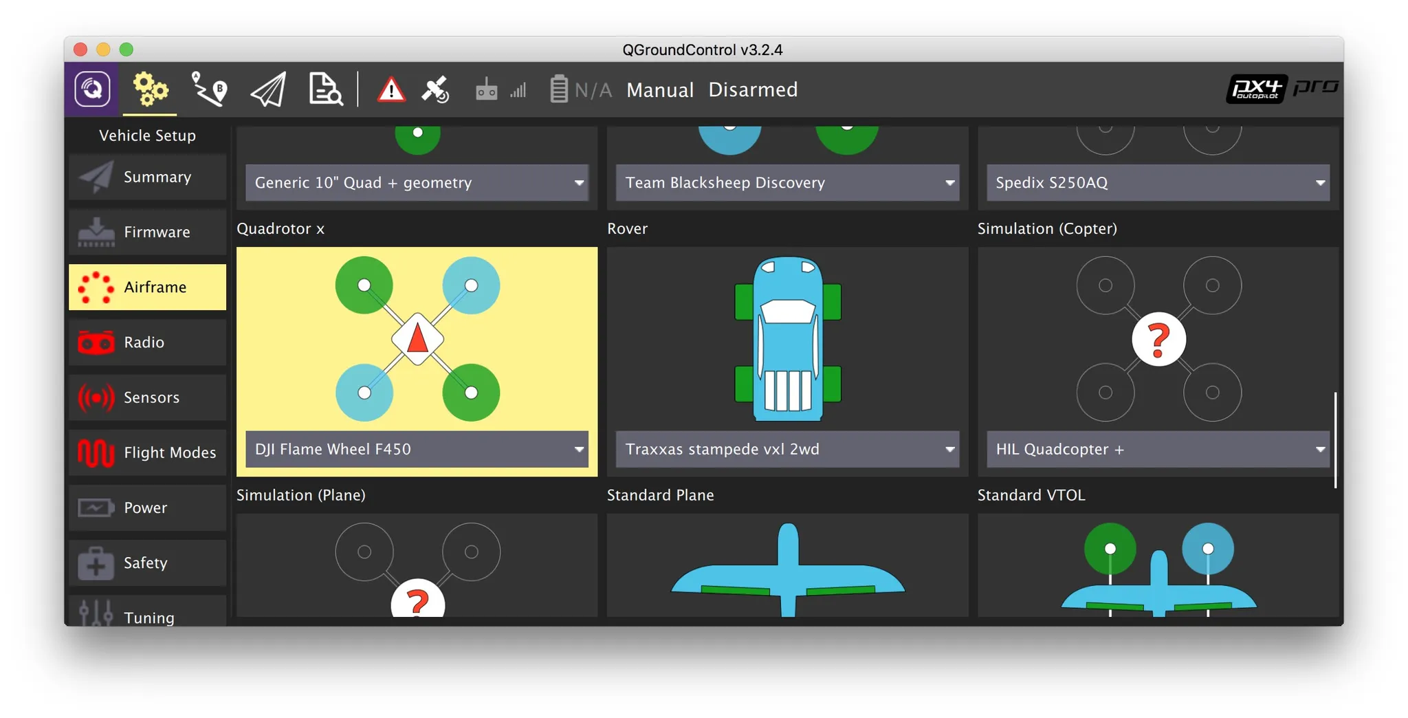 Start with the airframe configuration. I’ll pick a DJI F450.