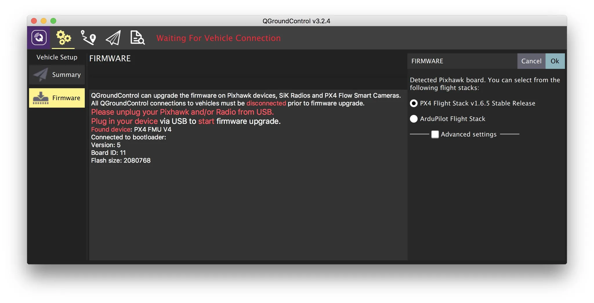 Plug in your Pixracer and hit “OK” on the right hand side to flash the latest firmware. You must plugin the flight controller after opening the firmware tab in order to flash firmware.