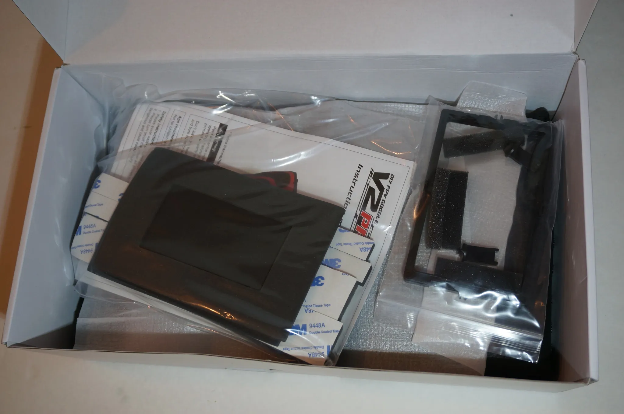 It comes with 3 different lenses of different magnification, some padding to change the shape of the goggles where they meet your face and an adaptor for your phone, if you want to use that instead of the monitor.