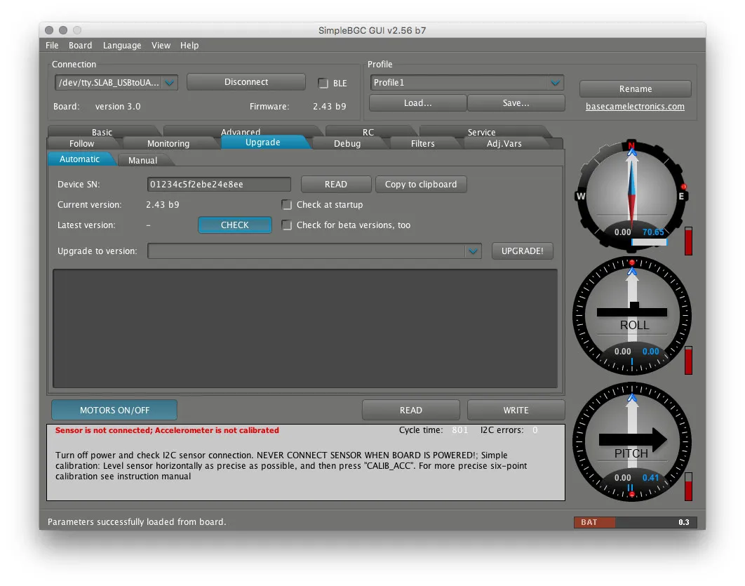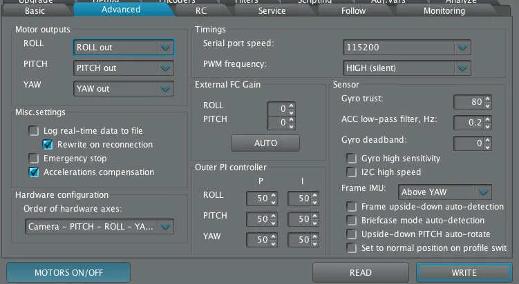 The beeper is really annoying when working on the SimpleBGC, so I turned it off. Just uncheck the Buzzer boxes on the Service tab and hit write.