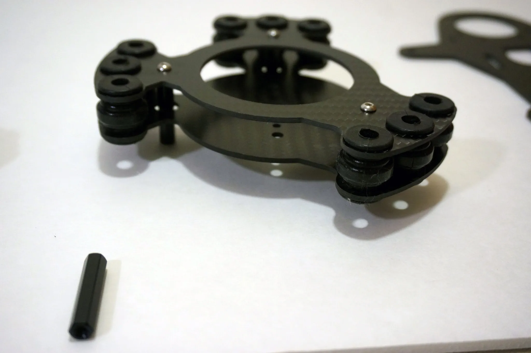 Begin by using the large vibration dampeners to connect the two circular carbon fiber plates.