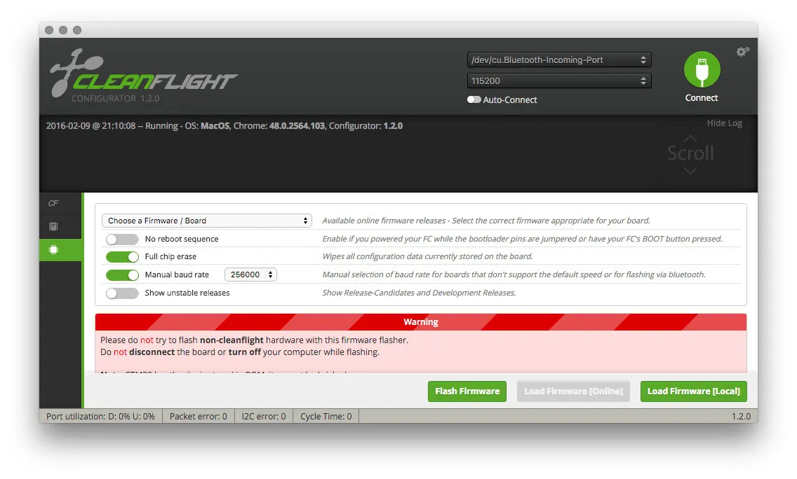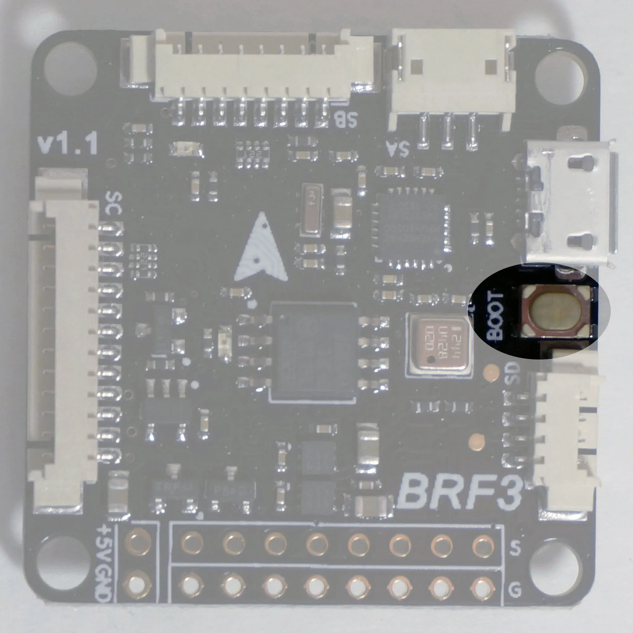 If for some reason that doesn’t work, flashing via bootloader mode is amazingly easy. Just unplug the BRF3, hold the boot button down while you power it on by plugging it into USB. Choose No reboot and hit flash.