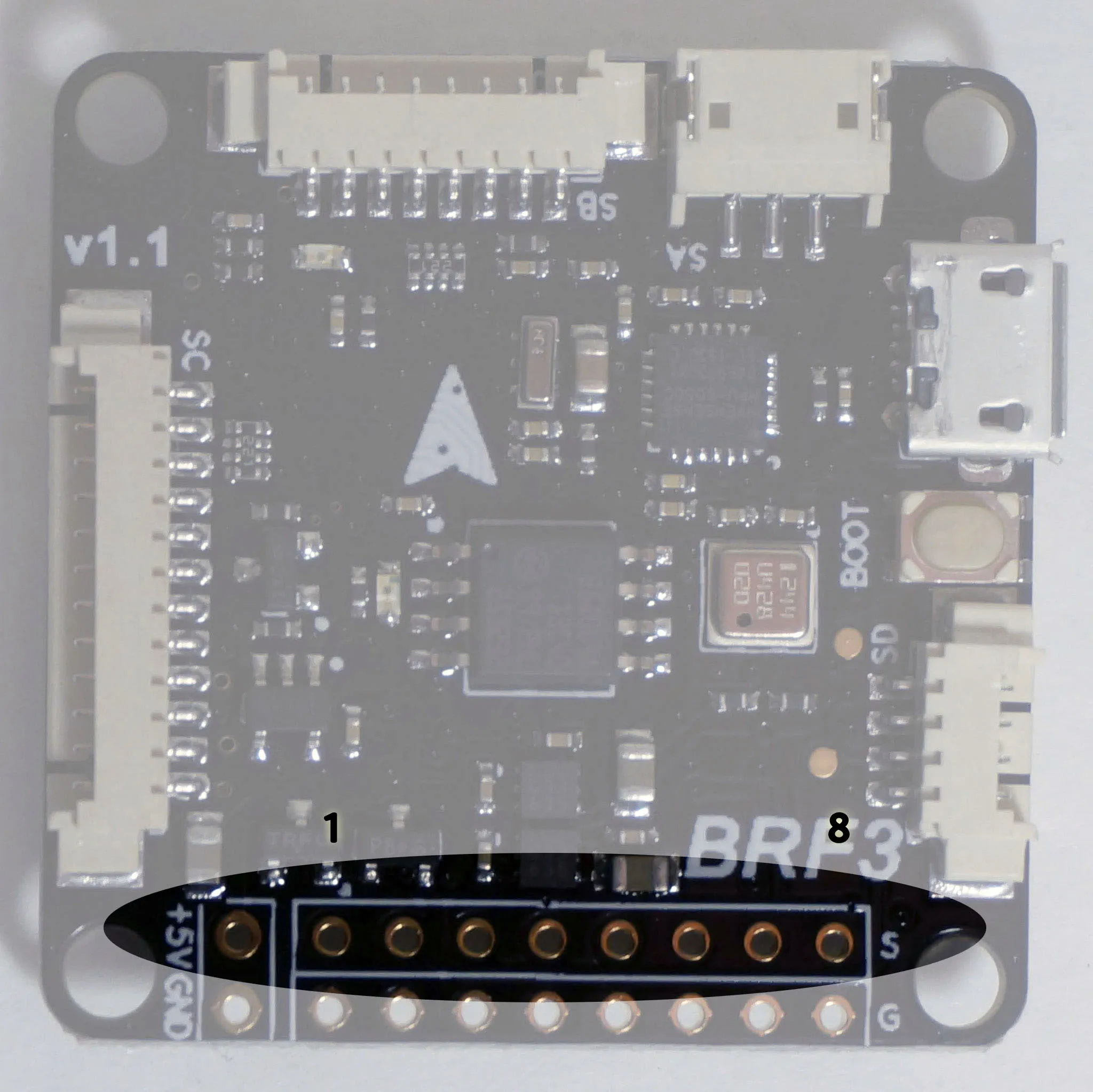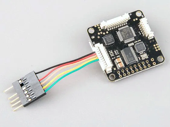 I’m a big fan of the small DF (also called SH) connectors. These are the long white plugs. They save space and are much easier to work with than the 2.54mm JST servo-style pins. Plus it makes stack-mounting multiple 35x35mm boards possible. The connectors on the BRF3 have been upgraded from SH1.0 to SH1.25, meaning the pins are ever so slightly larger and more robust, but the connector size is still tiny. Plus, this is the same pin spacing as the PixHawk, which means you can start re-using cables between some projects!