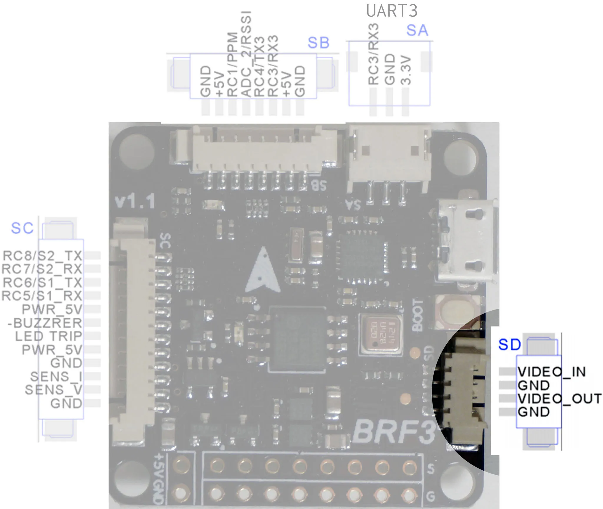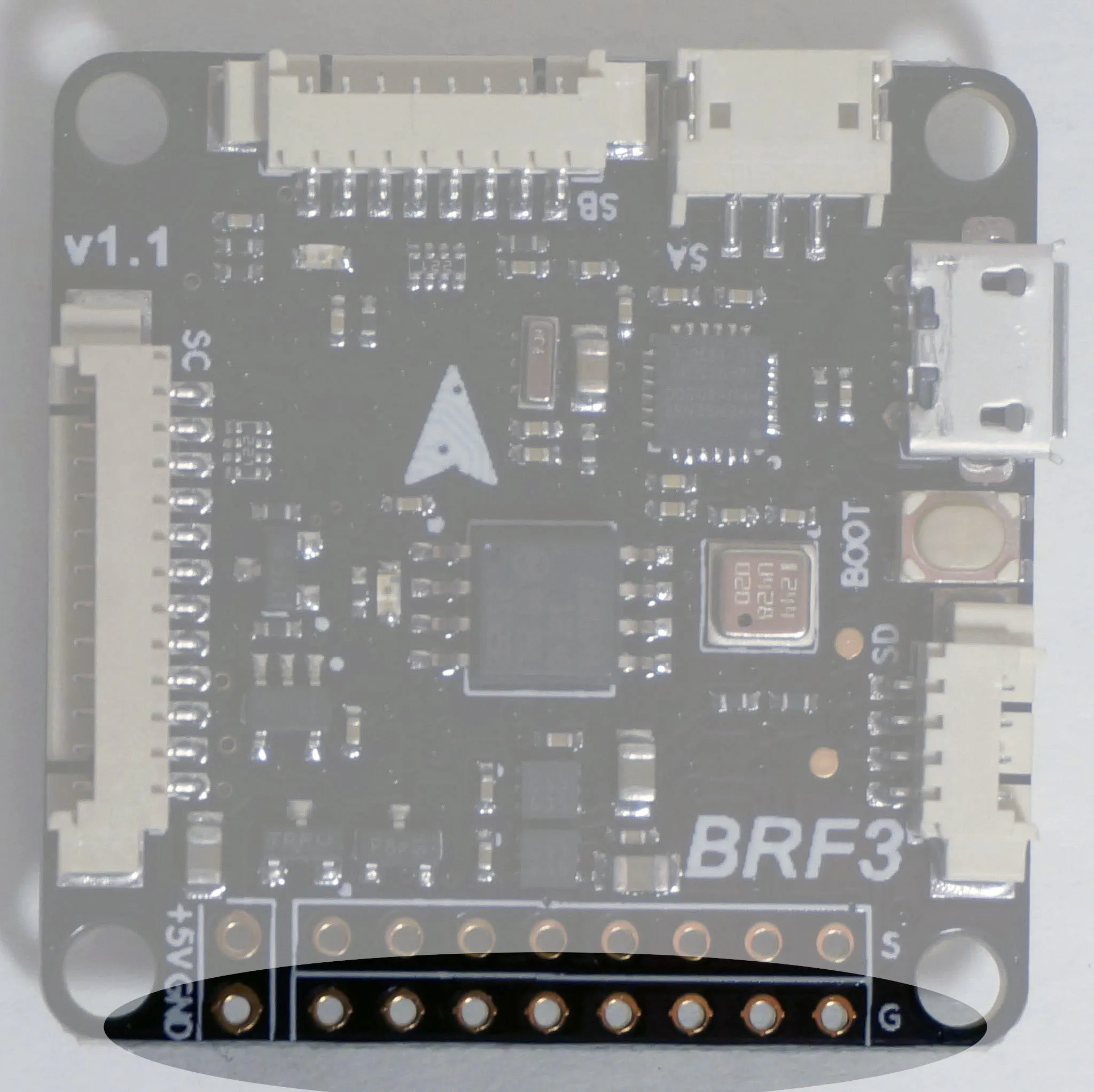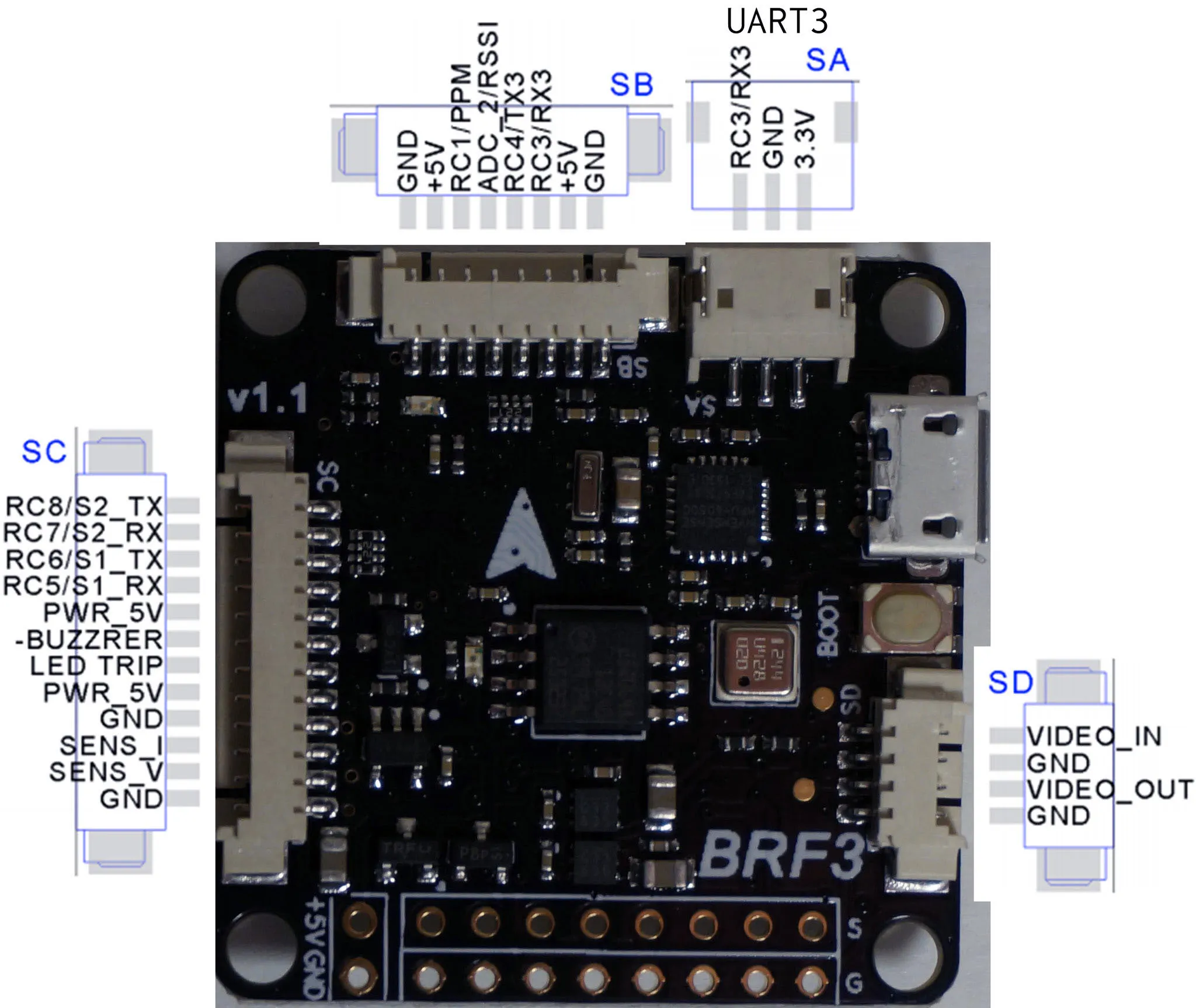 The BRF3 has 8MB of flash for blackbox logging. This is way more than the 2MB included on the CC3D and full NAZE32. Flash, by the way, is way faster than an SDCard-based OpenLog device, so you’ll never miss a frame of data.