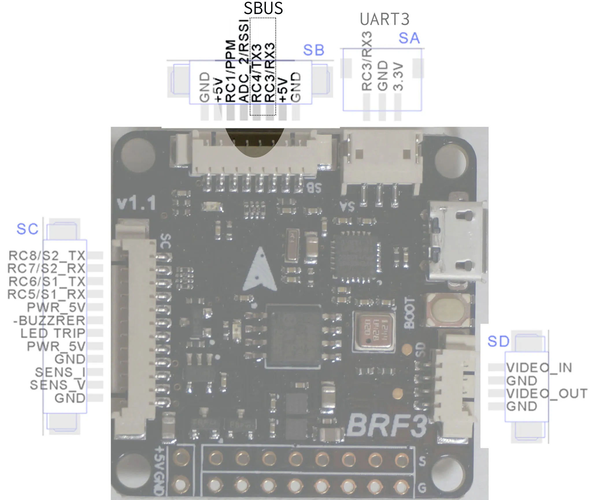 Although I don’t have an S.Bus RX to confirm this, it looks like an external inverter is not necessary. It should work fine plugged in directly to UART3. Make sure you take either 5v from the same port or 3.3v from the Spektrum port, depending on what voltage your receiver can handle.