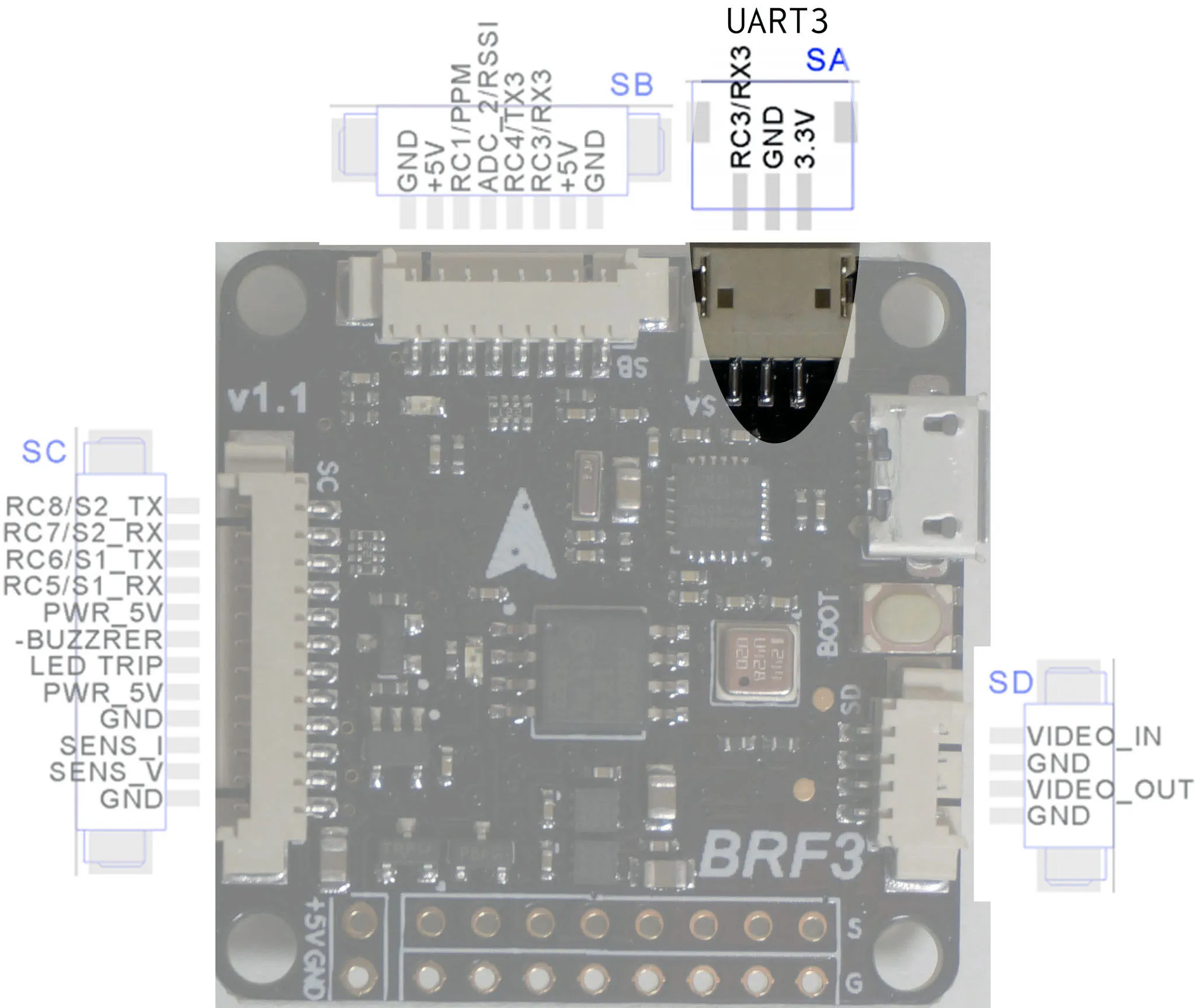 Note that the UART3 RX pin is available on both port SA and port SB. Either can be used.