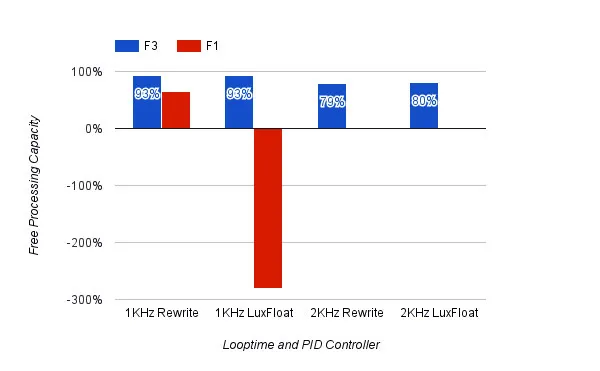 I did some further testing, taking the average free processing time for both the F1 and F3 processors. These were taken with the following sensors enabled: GYRO:MPU6050, ACC:MPU6050, BARO:BMP085. There are no data points for 2khz on the F1, since it is not possible to run 2khz with these sensors enabled. The closer a value is to 100%, the better.