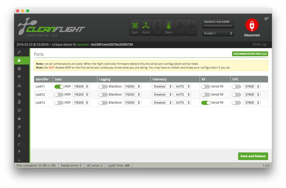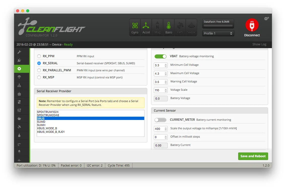On the Configuration Tab set Receiver Mode to Serial RX and choose your Serial Receiver Provider, I’m using SBUS