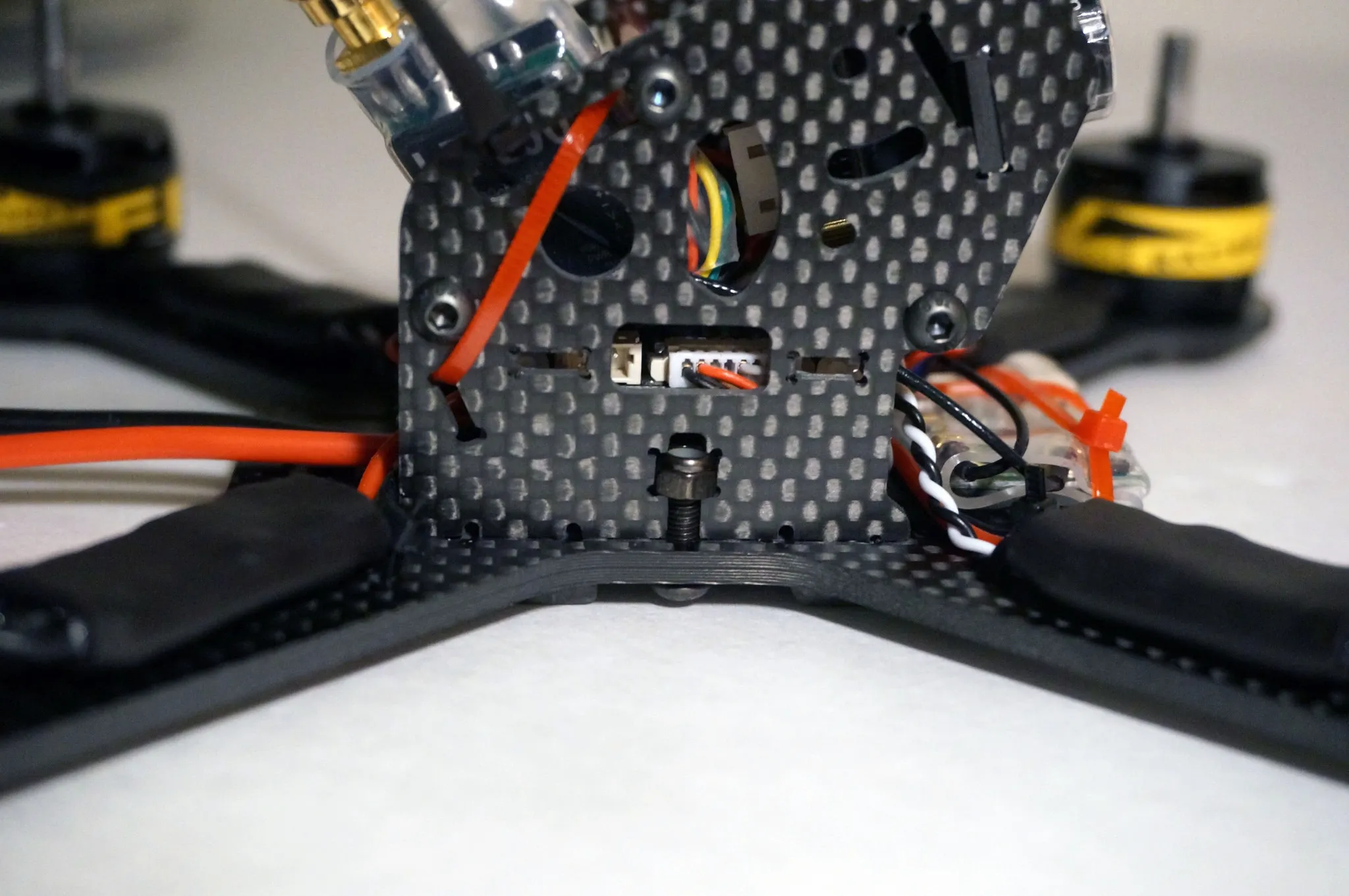 Attach some zip ties, sticking up on the back and then heatshrink your antenna wires to the zip ties. One of my antenna wires is much shorter than the other because of the receiver’s position, but no worries. I kept it symmetric by using zip ties and heatshrink of the same length, even on the shorter side.