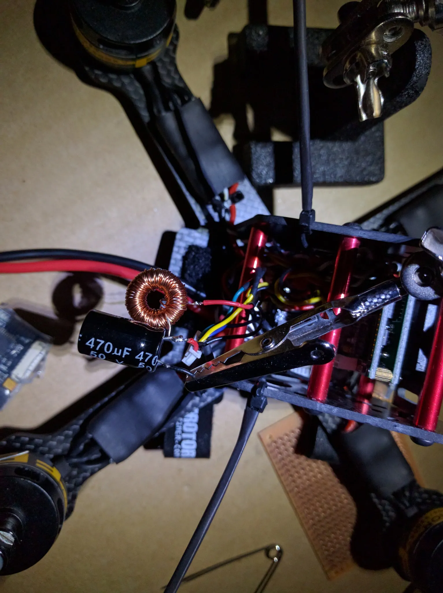 I used a 330UF inductor and 50v, 470uF capacitor. Almost any inductor will work. You’ll want a 470uF+ capacitor that is rated for 20-50% more volts than you plan to run on your quad. For example my high voltage lipos run at 17.4v fully charged so at a minimum you’ll want a 20.88v rated capacitor. I used a 50v just to be safe.
