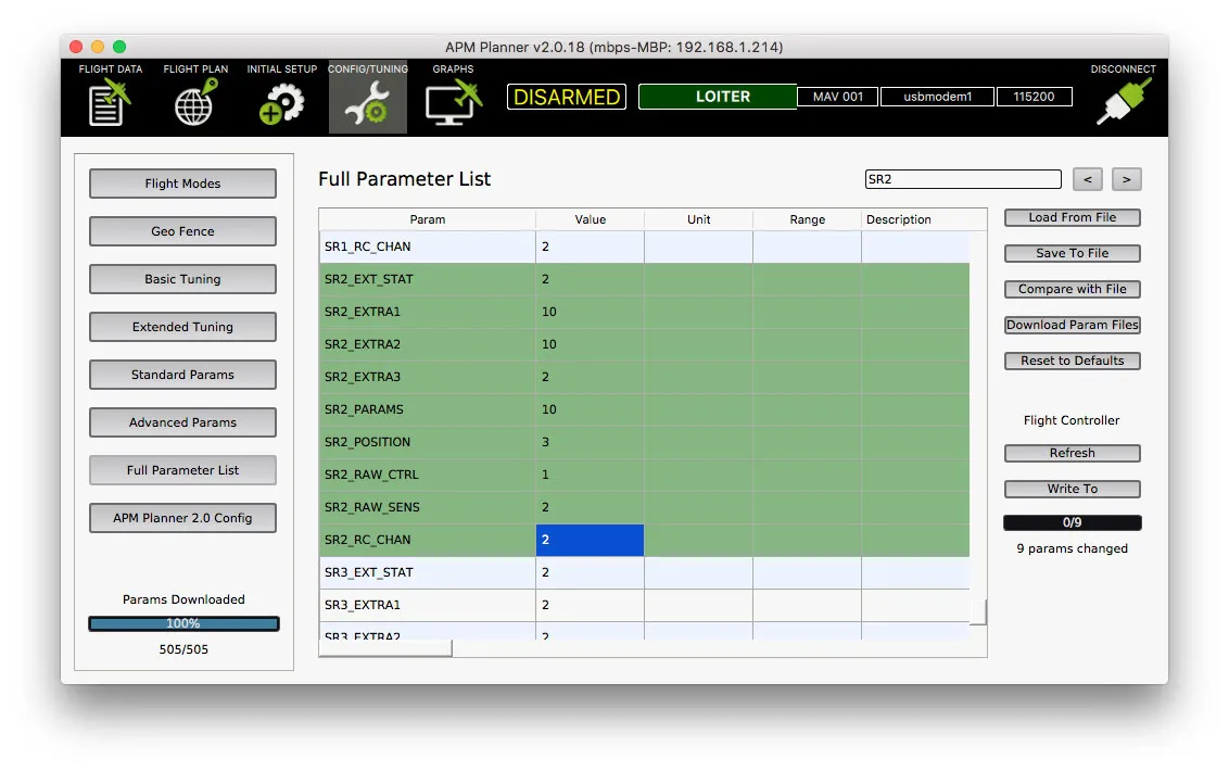 Finally, configure the flight controller to send data to the MinimOSD. In Apm or Mission Planner, open the Full Parameter list and search for SR2