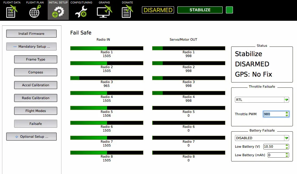 Start by testing your throttle channel. When you turn off the radio, it must go at least 10 points lower than the Throttle Failsafe PWM value. I increased the Throttle PWM value to 980 to ensure this happens. This test makes sure that the Throttle Failsafe action occurs when the radio link is lost.