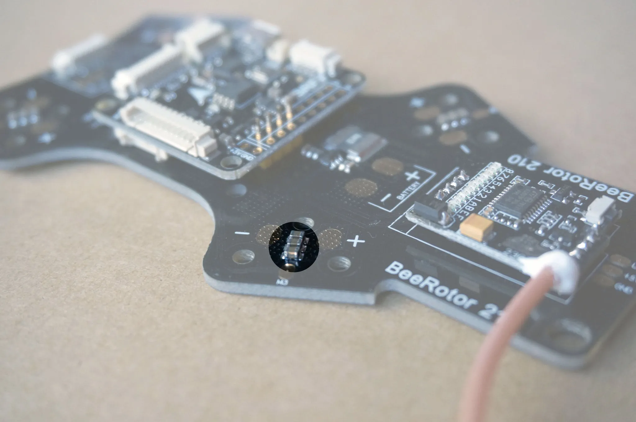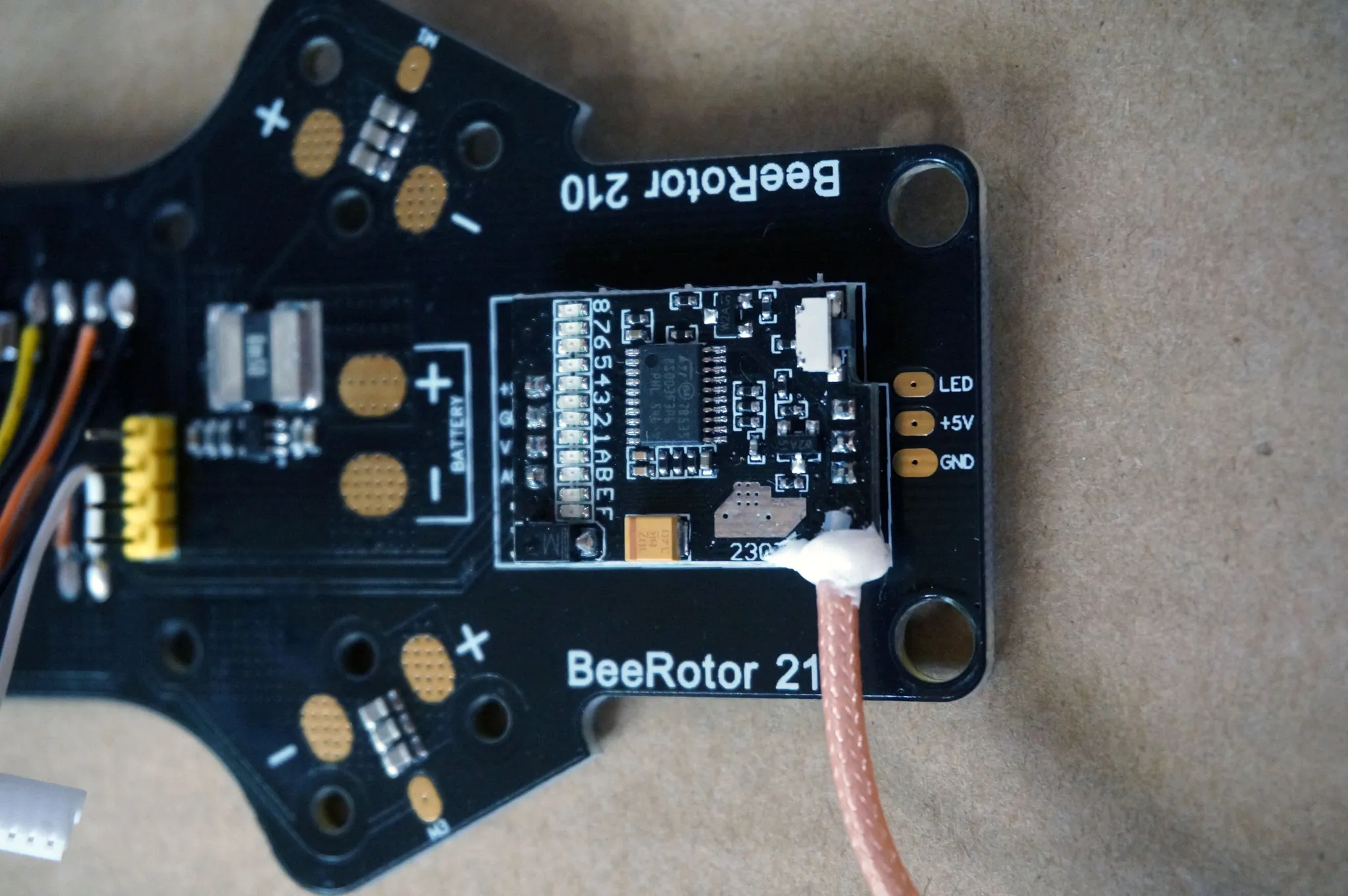 We’re about to cover the GPS port with the beeper, so if you’re going to use that in the future, plug it in before installing the flight controller.