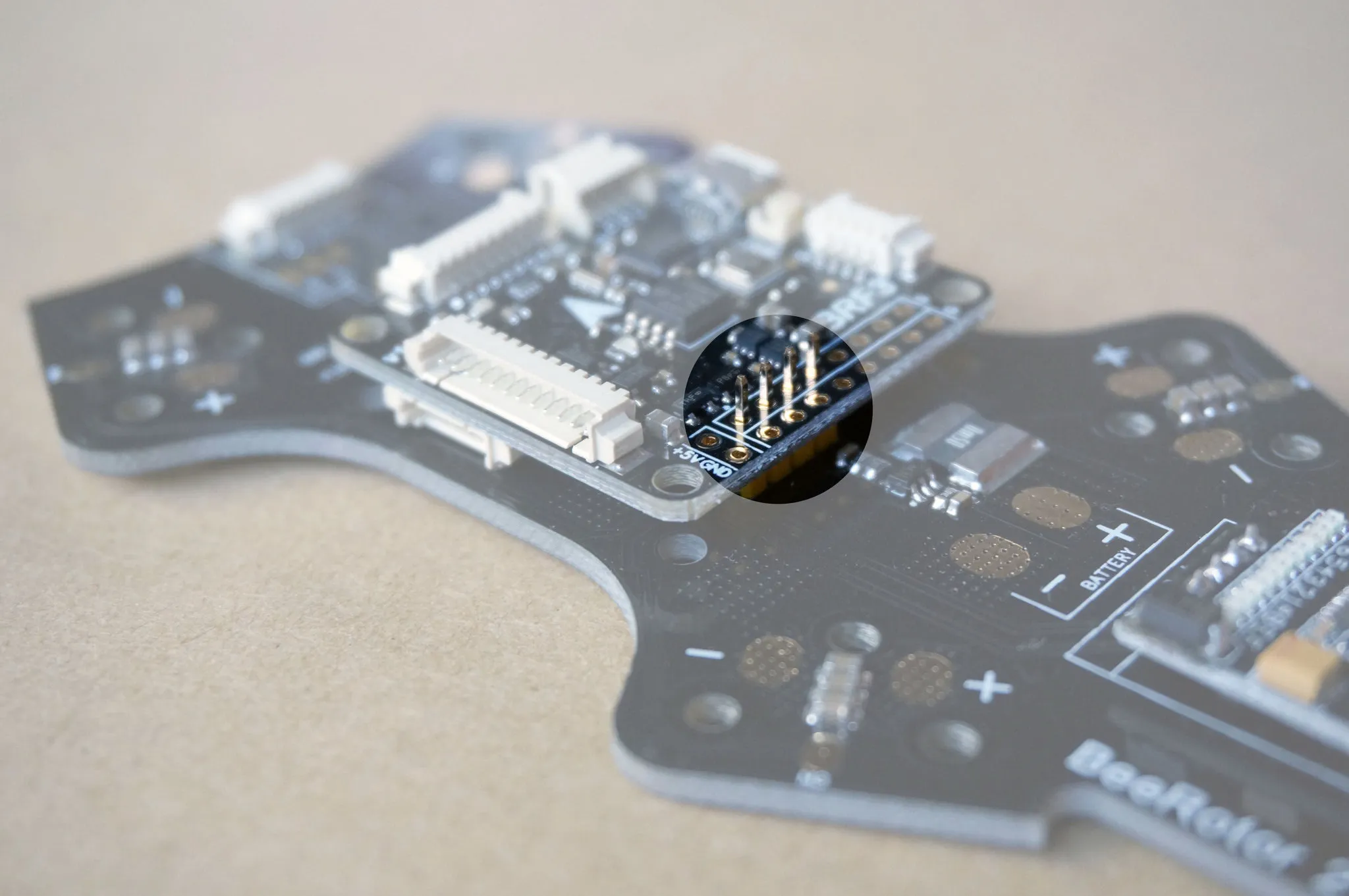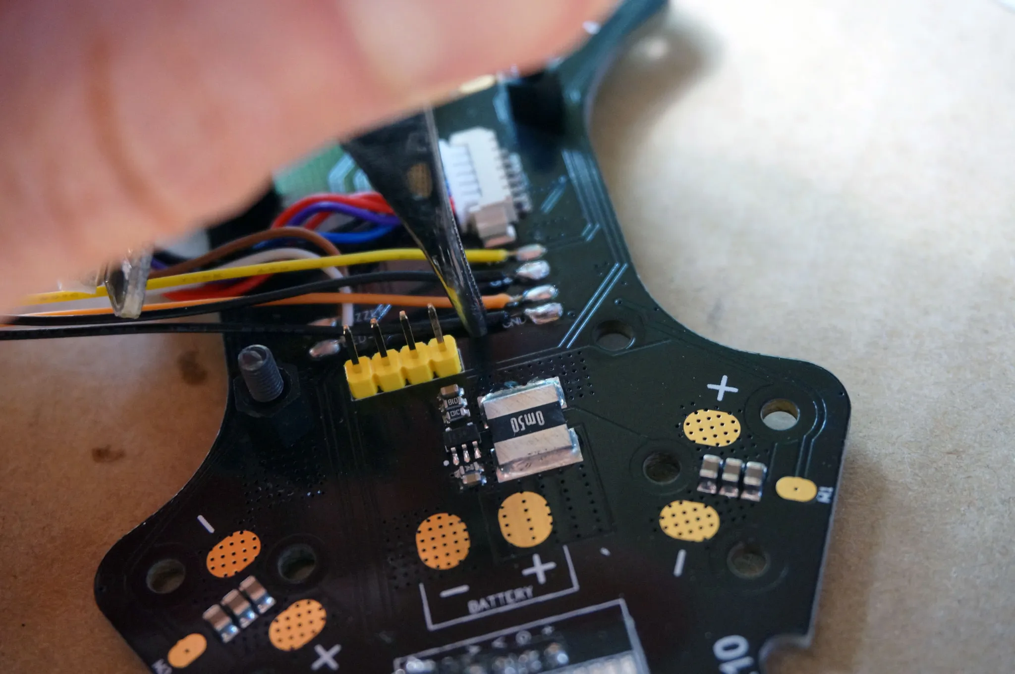 Solder the ESC pins. It would be nice if these were a SH1.25 connector on the PDB side with female 2.54mm headers on the other side, so the flight controller could be removed without de-soldering these in the future.