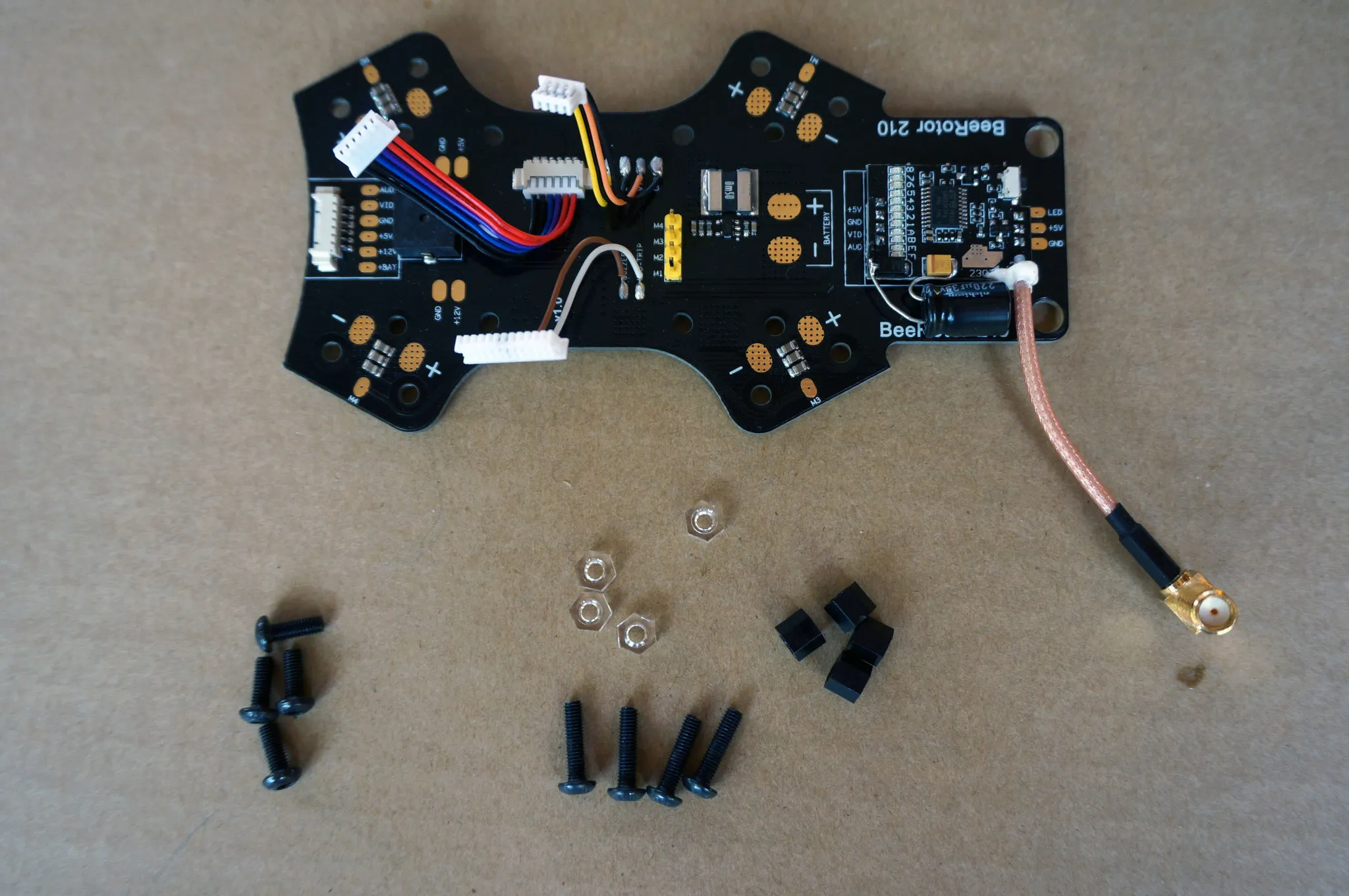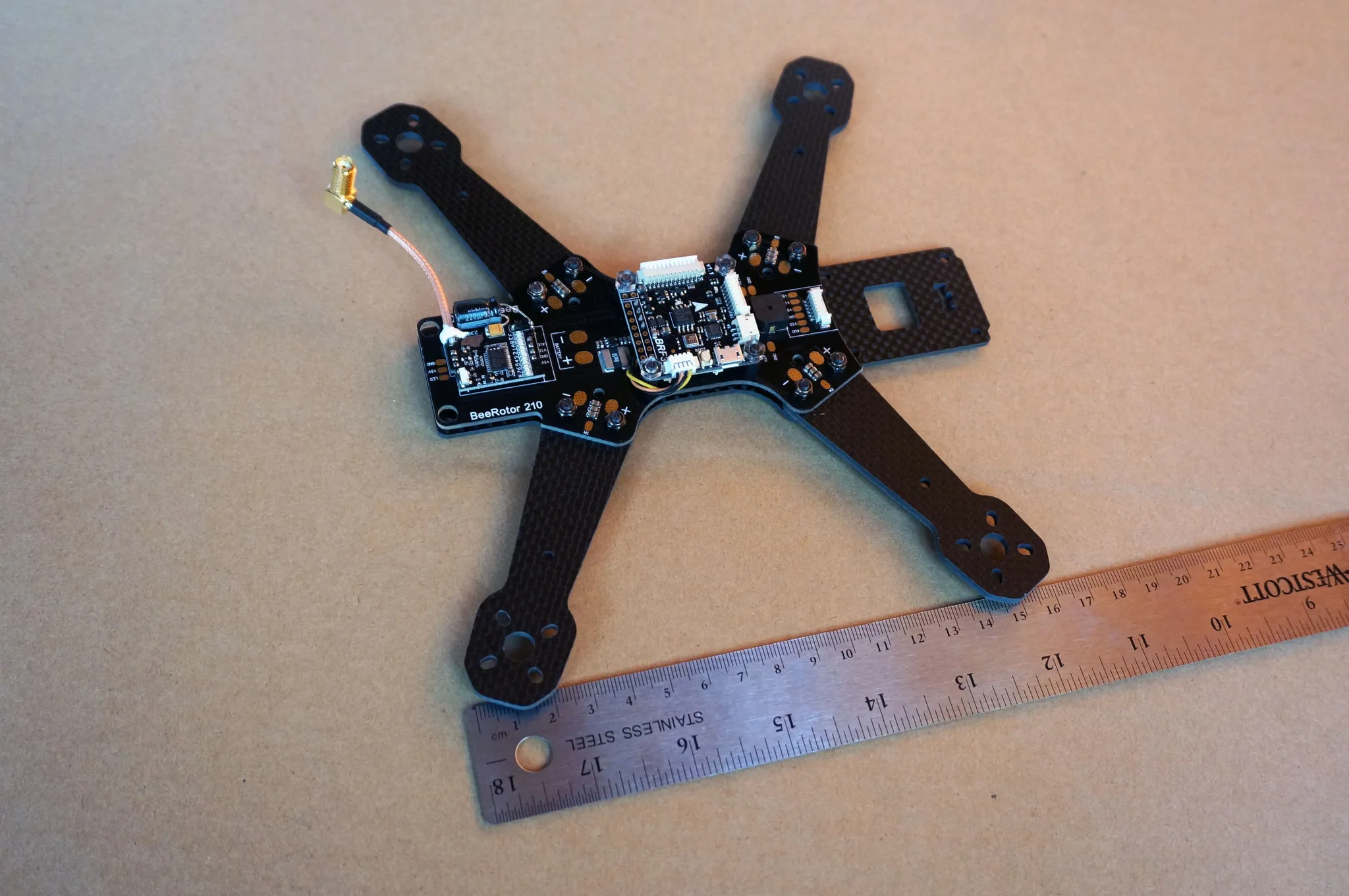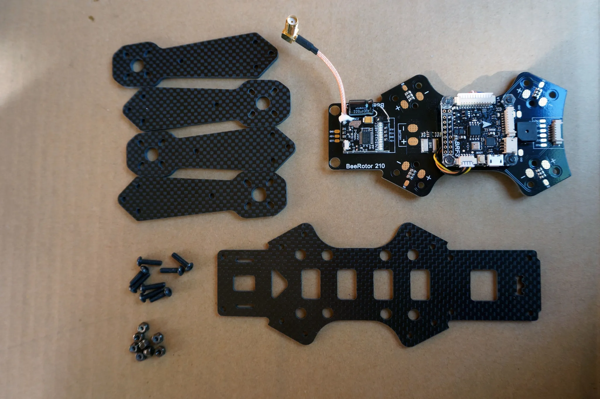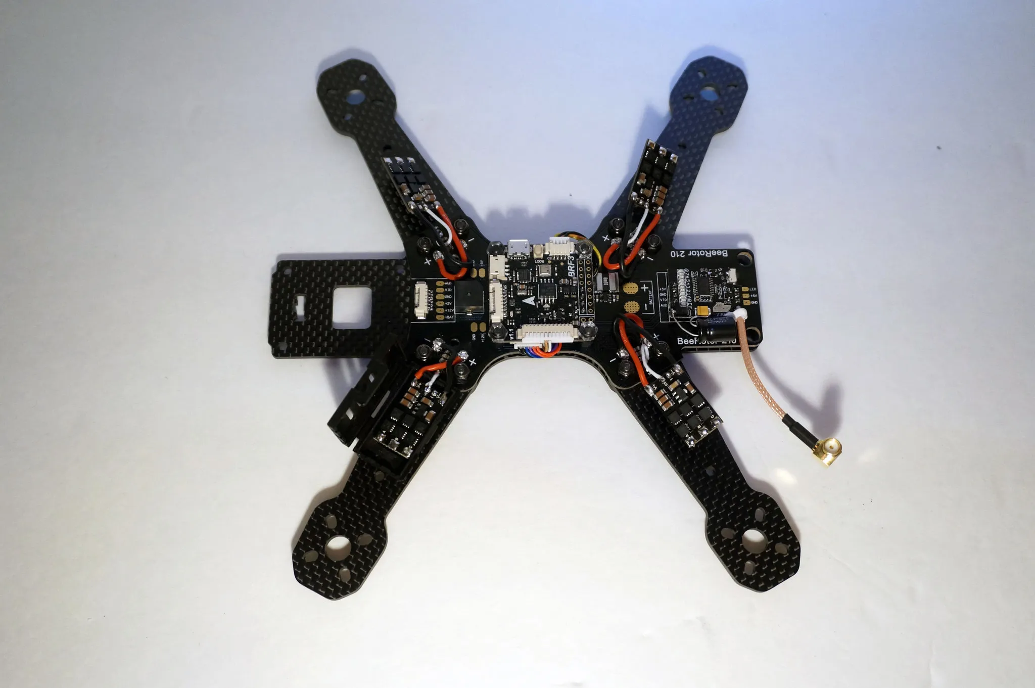 The BeeRotor u210 uses an integrated PCB to make assembly easy. Combining this with the standard carbon fiber top and bottom plates (2mm) and 3mm carbon fiber arms, we get this without sacrificing strength.