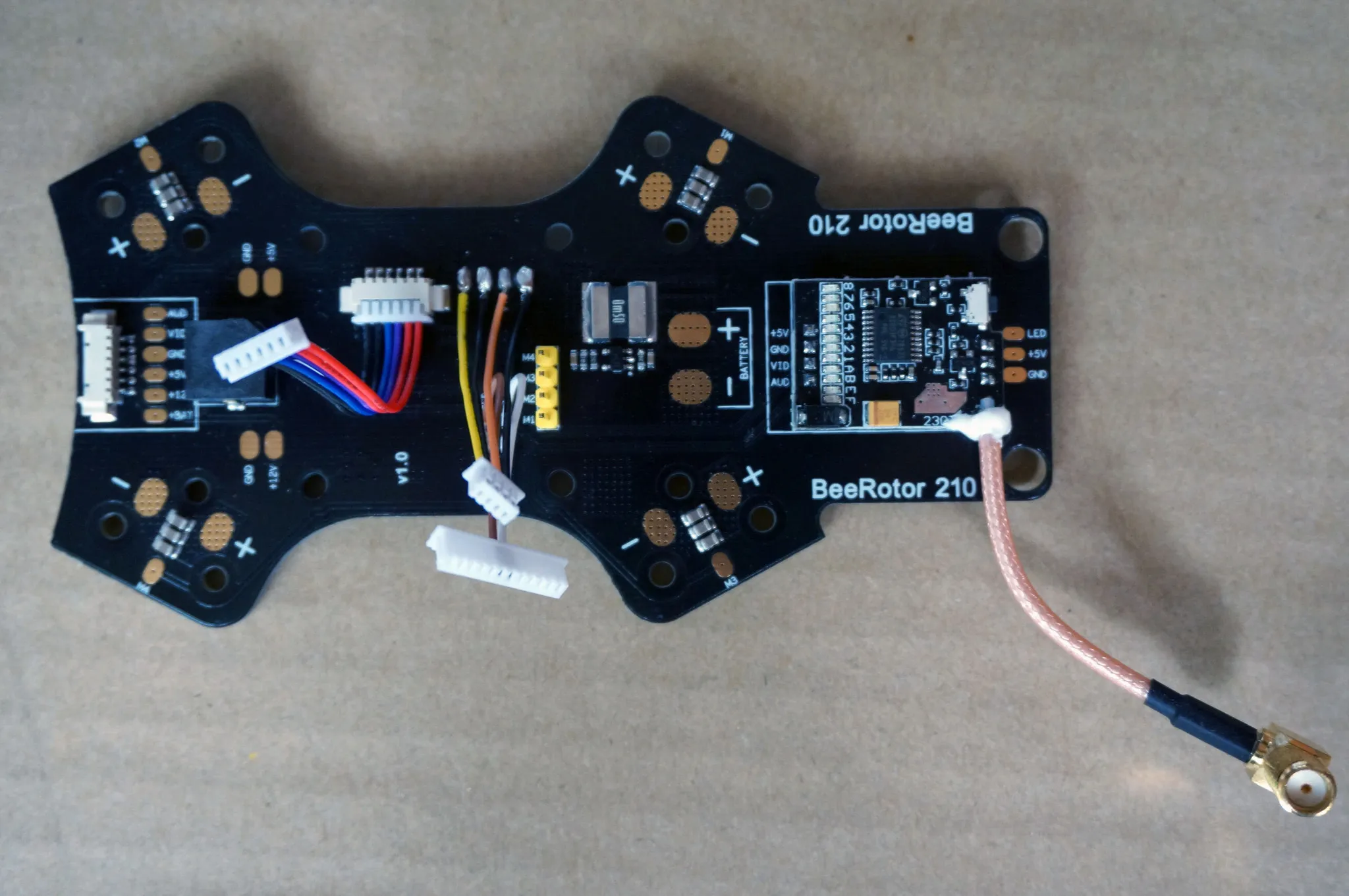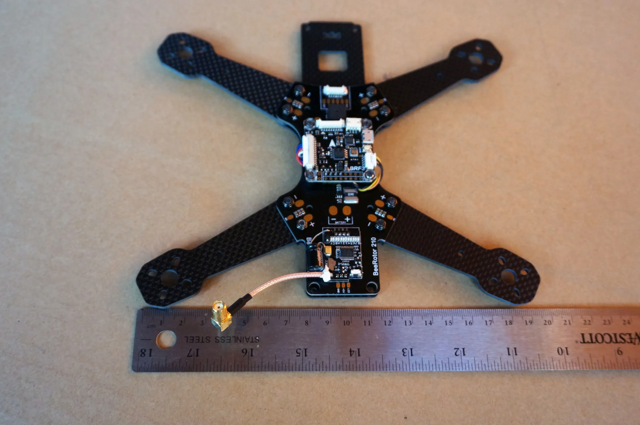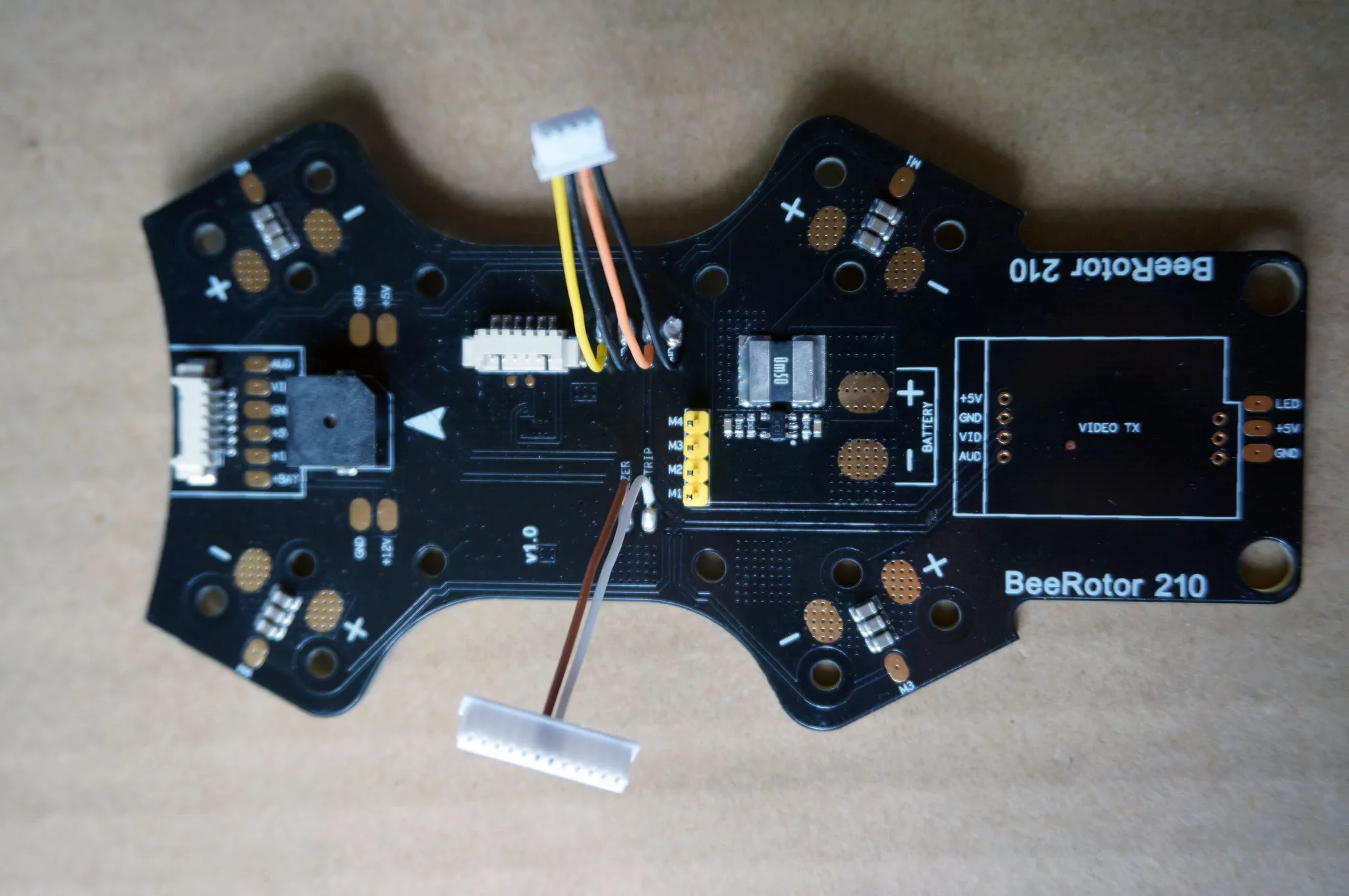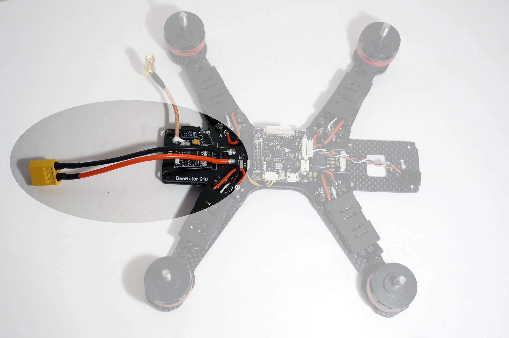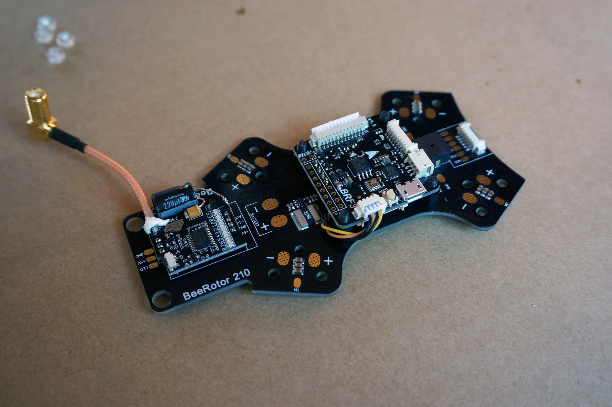 The BeeRotor u210 uses an integrated PCB to make assembly easy. Combining this with the standard carbon fiber top and bottom plates (2mm) and 3mm carbon fiber arms, we get this without sacrificing strength.