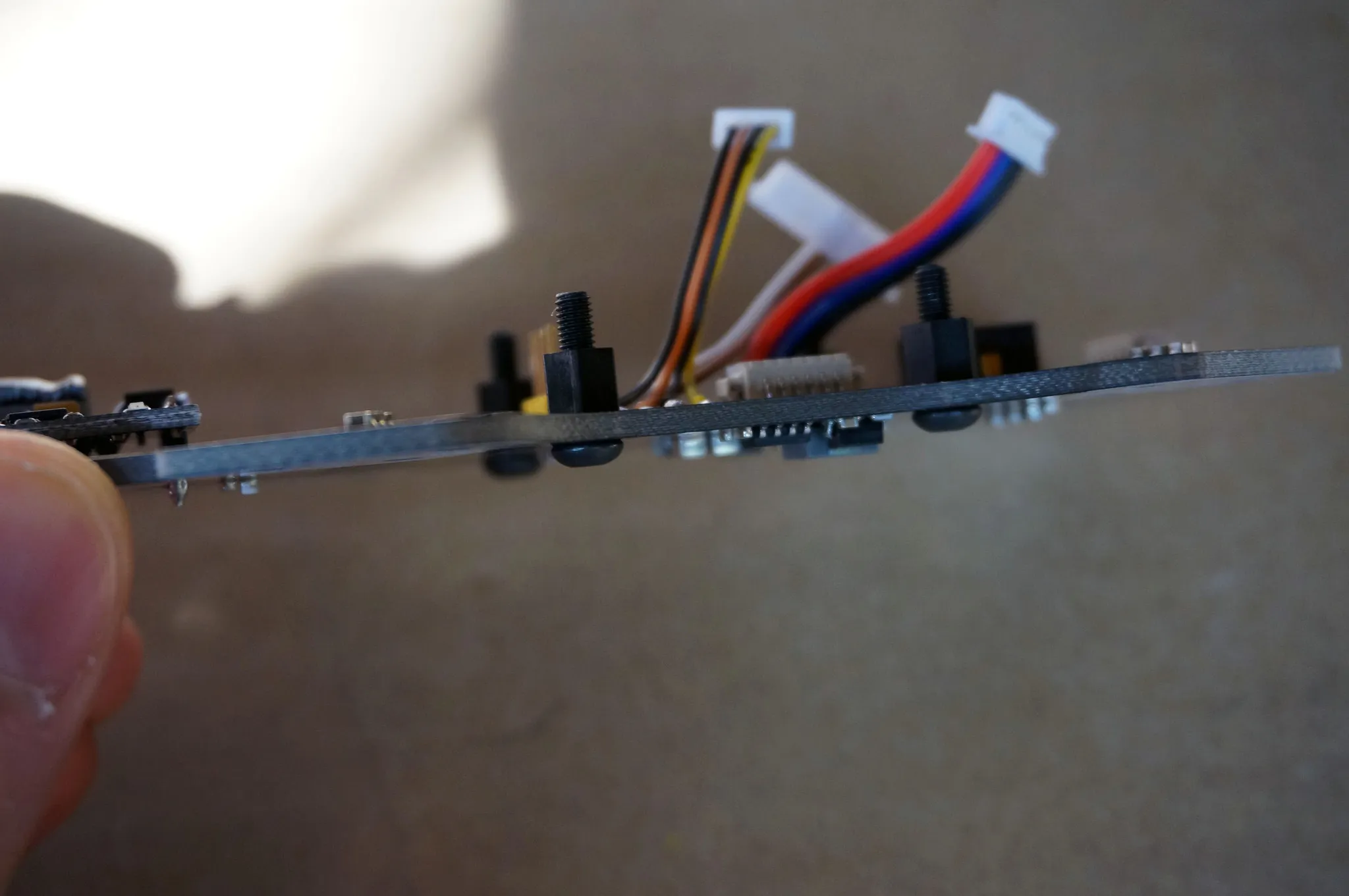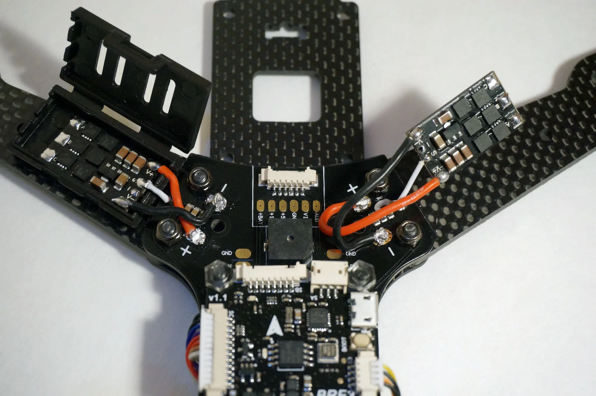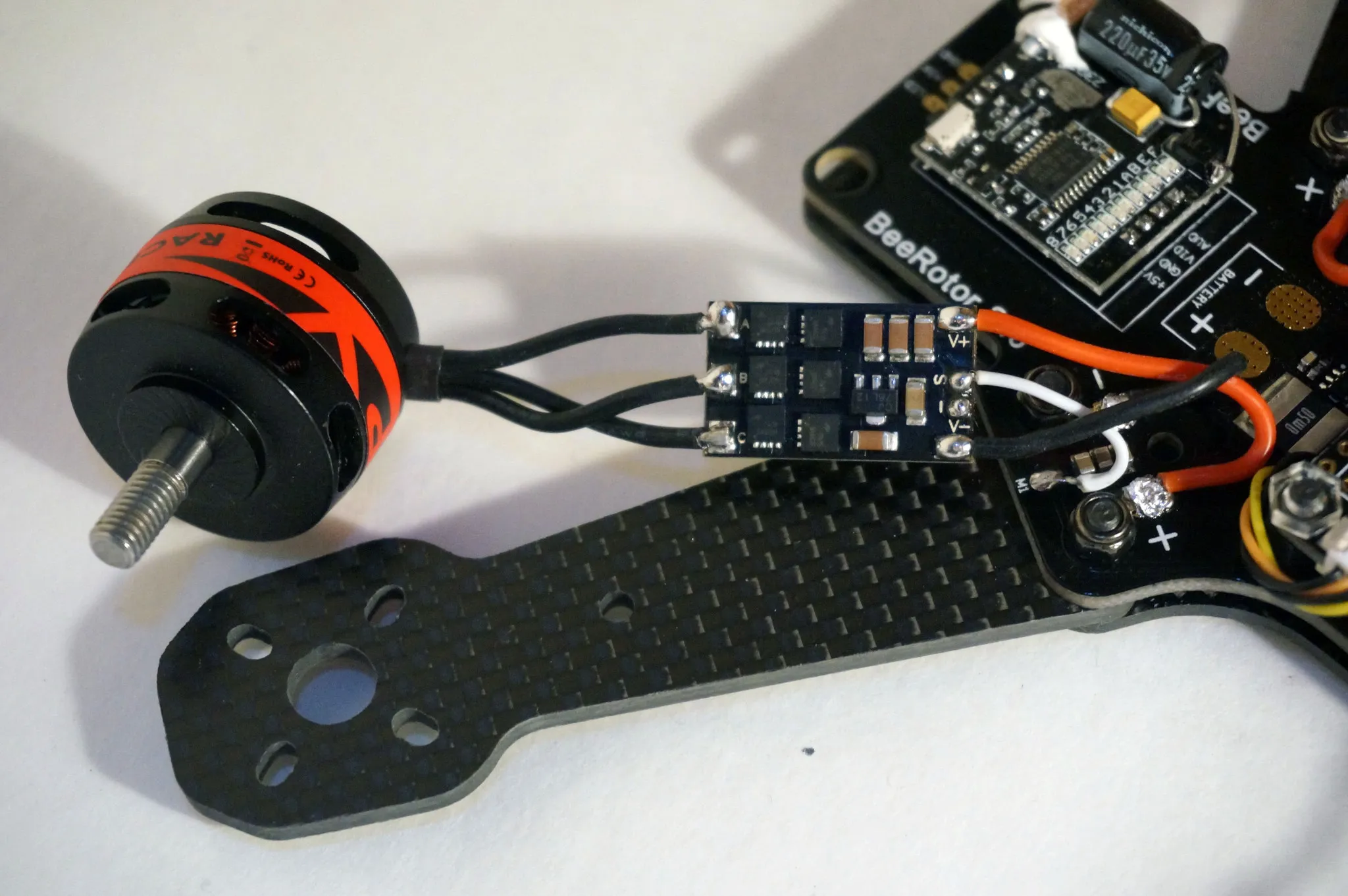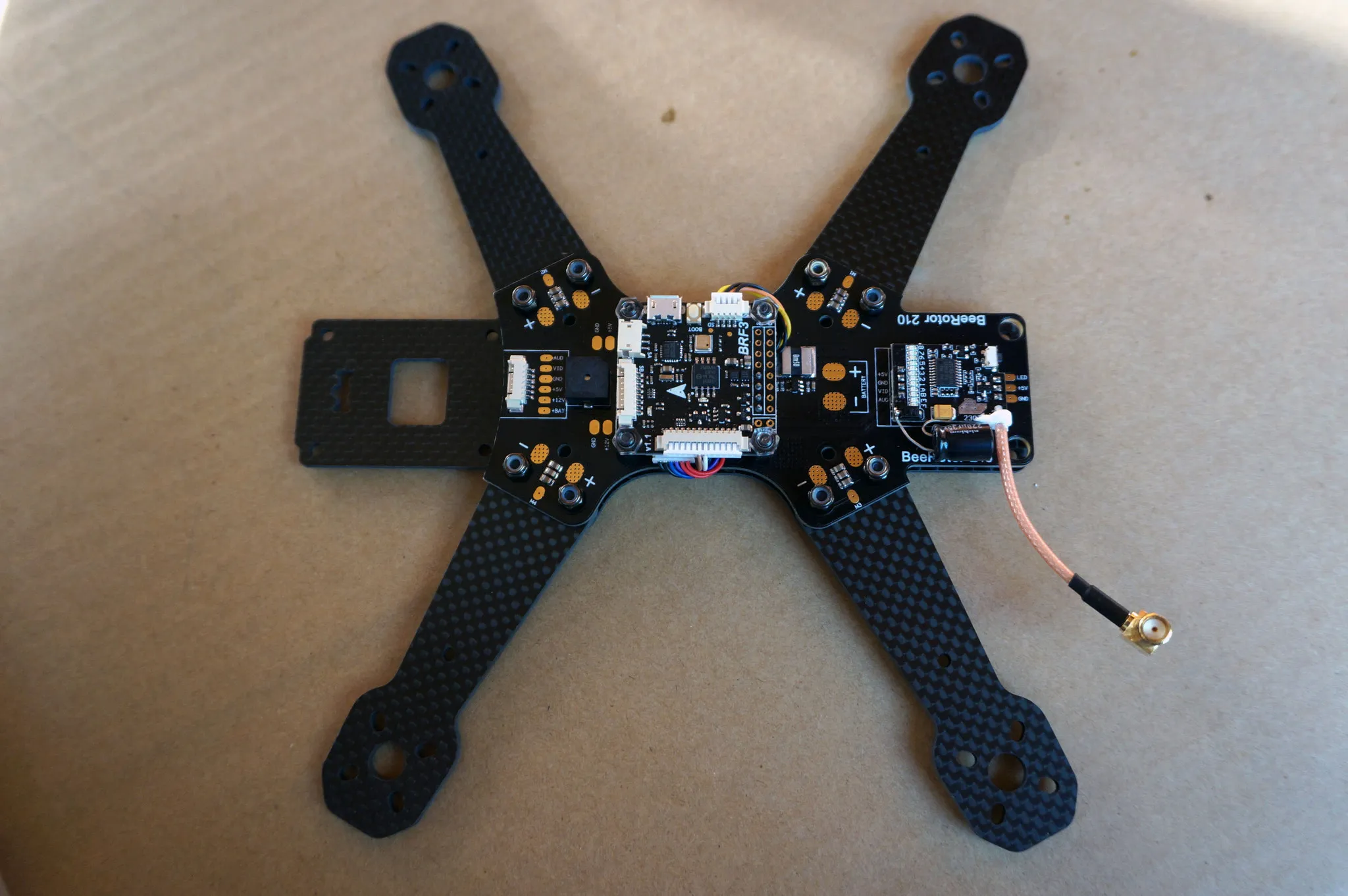 The BeeRotor u210 uses an integrated PCB to make assembly easy. Combining this with the standard carbon fiber top and bottom plates (2mm) and 3mm carbon fiber arms, we get this without sacrificing strength.