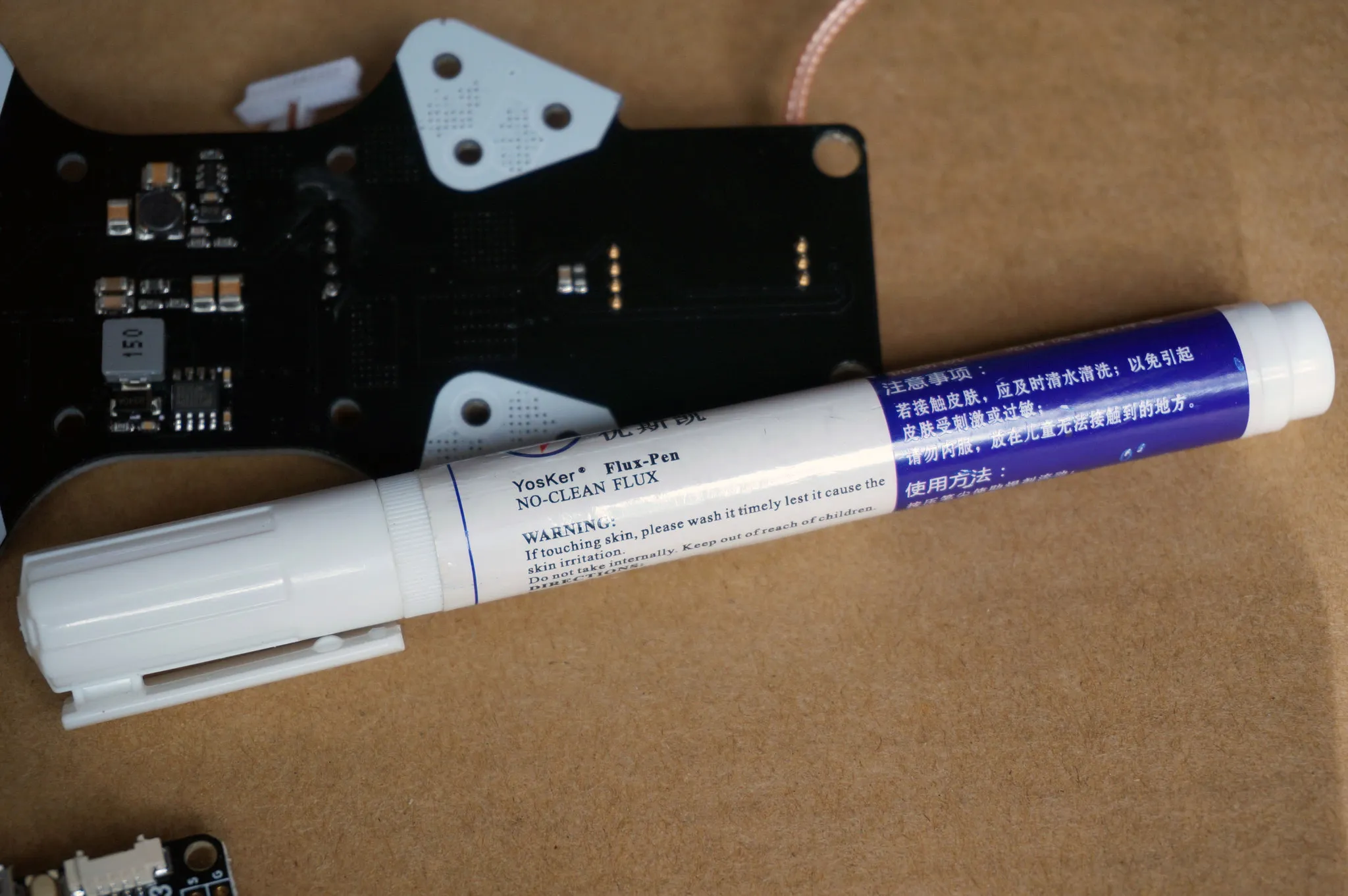 Flip the board over and solder the 7 pin headers into place. It’s not absolutely necessary, but it makes soldering slightly easier if you use a flux pen to flux the joints first. Just touch the tip of the pen to each pin to get some flux liquid in the joint before soldering.