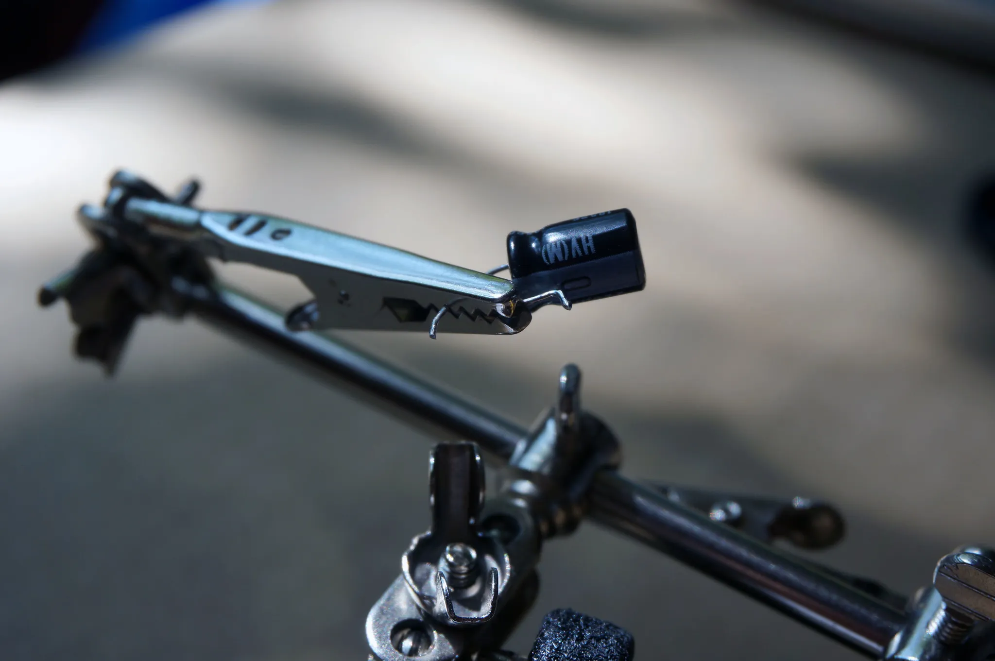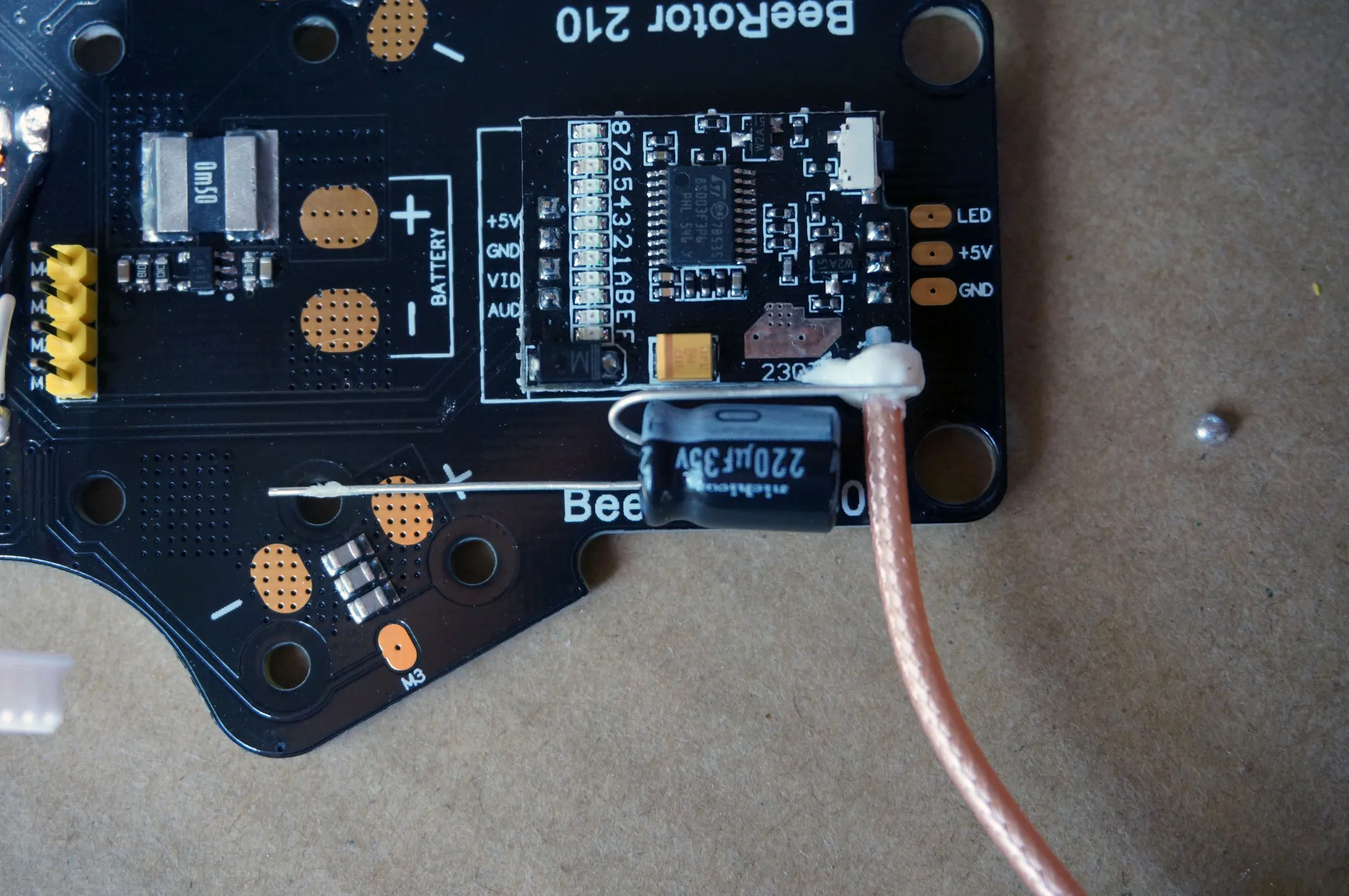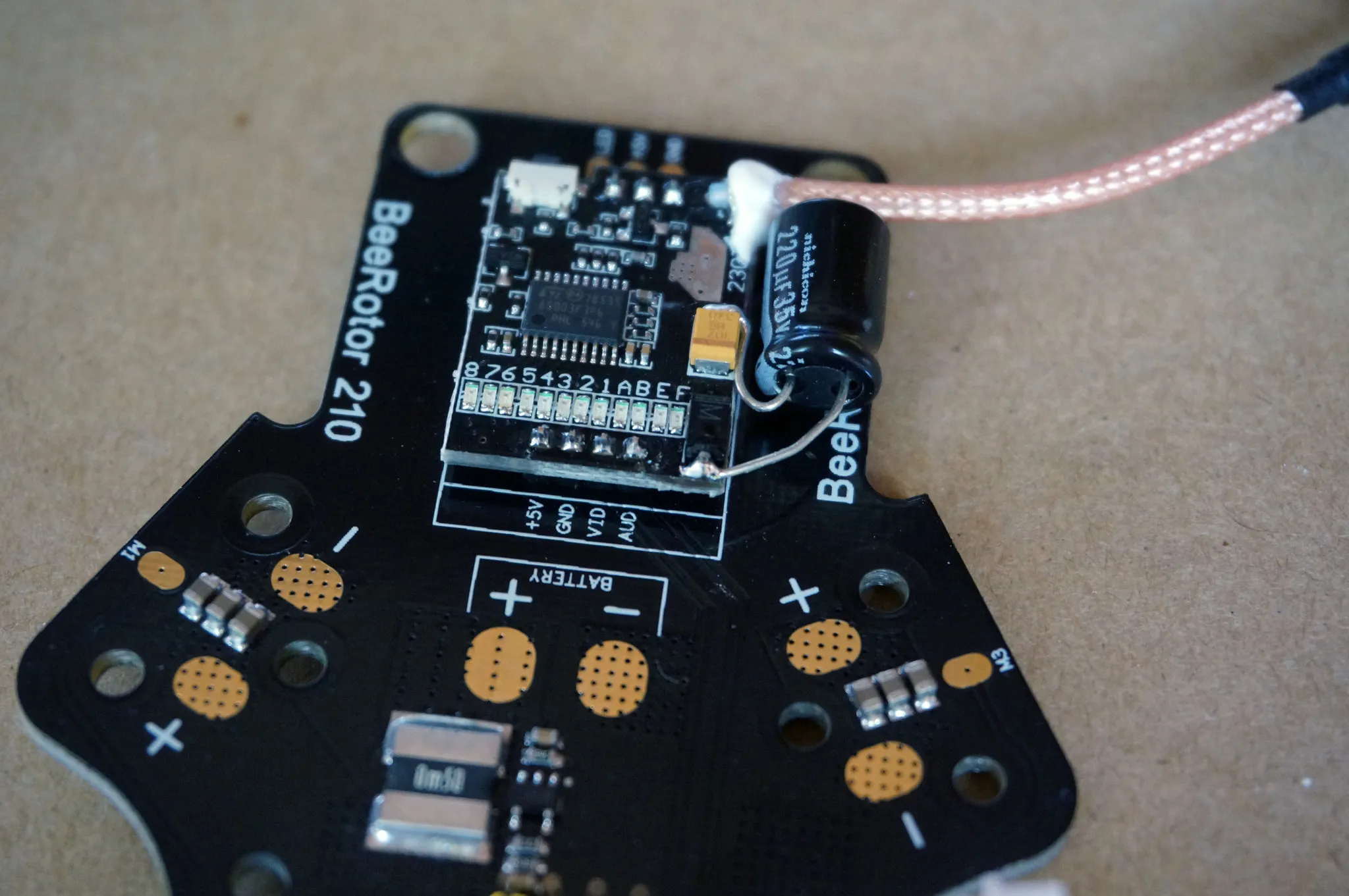 Capacitors do have a polarity (plus and minus side), so be sure to solder the pin with the white stripe to the far side of VTX's yellow component (which is also a capacitor, by the way) and the pin without the white stripe, to the far side of the black component (this component is a diode).