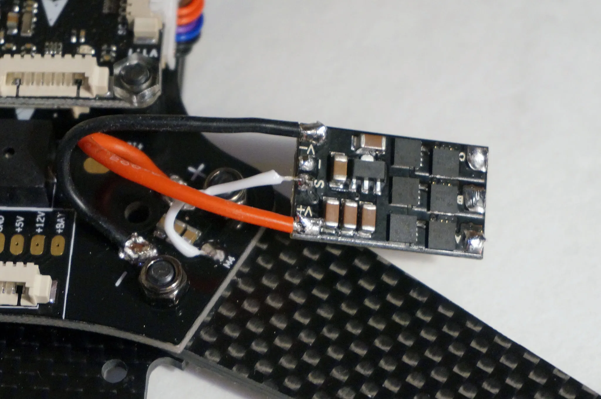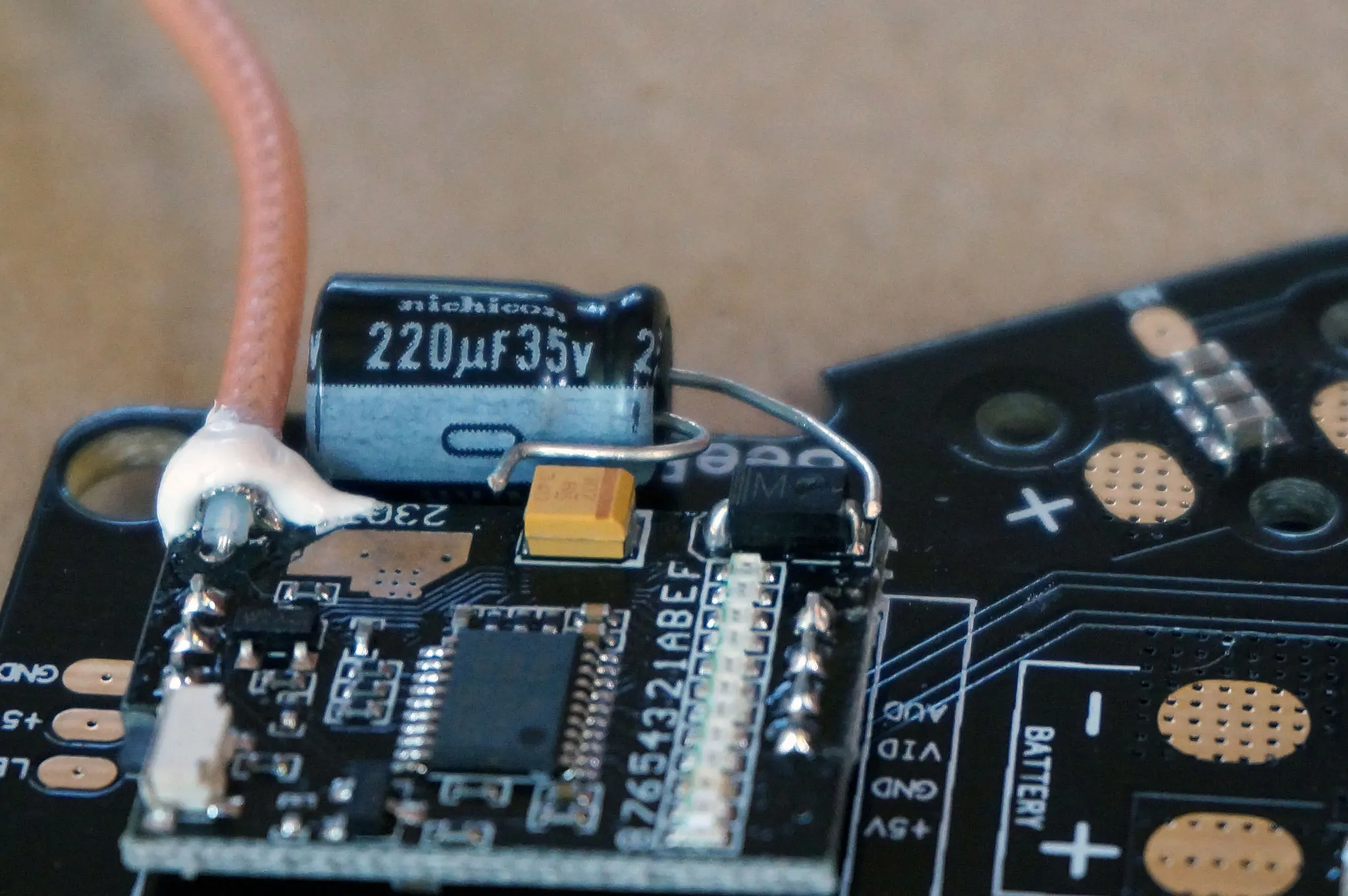 First, you might have noticed that the PDB has some extra stuff on it. Notably these capacitors, which are inline with the ESC power wire and help minimize system noise caused by the ESCs.
