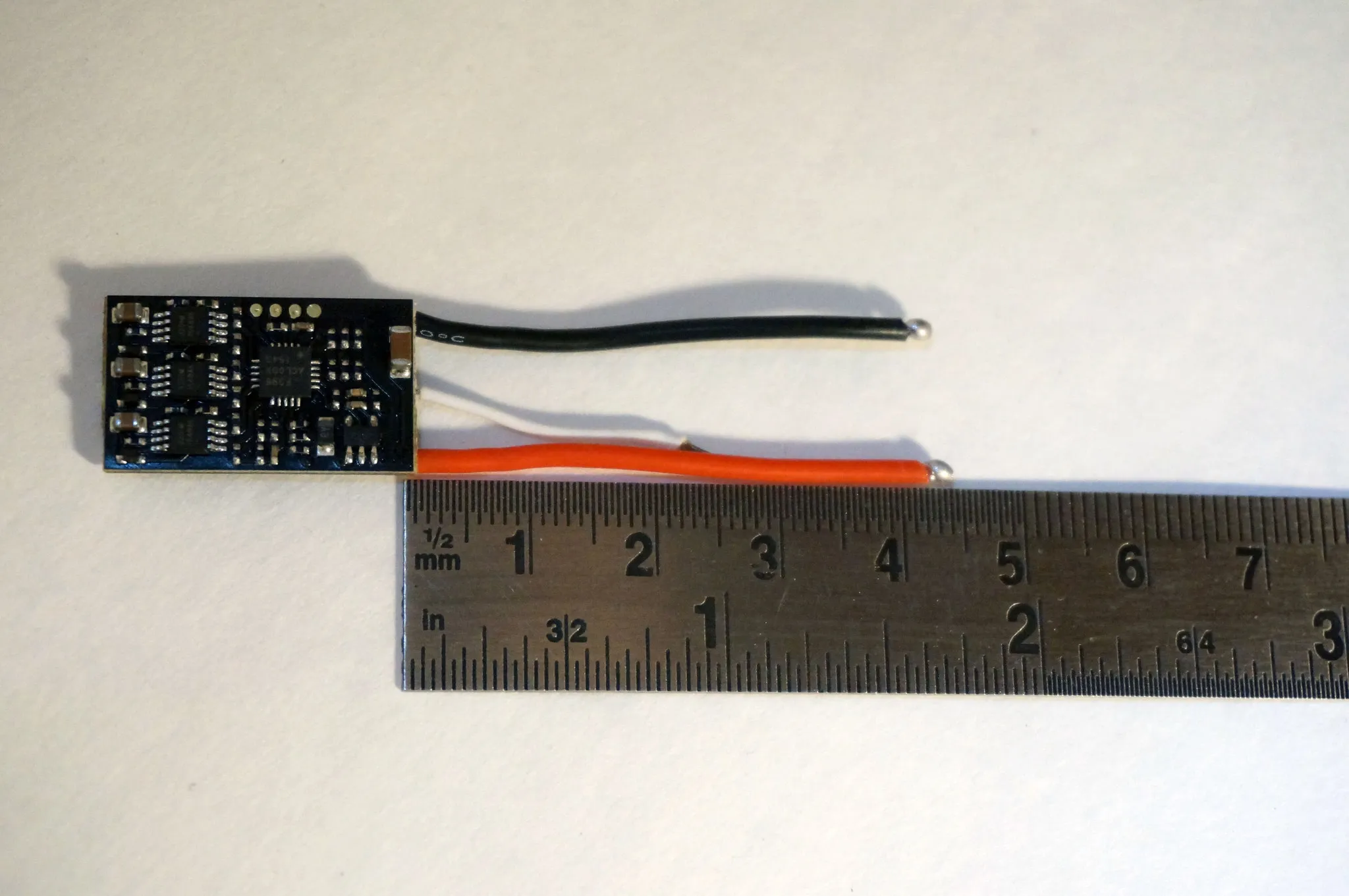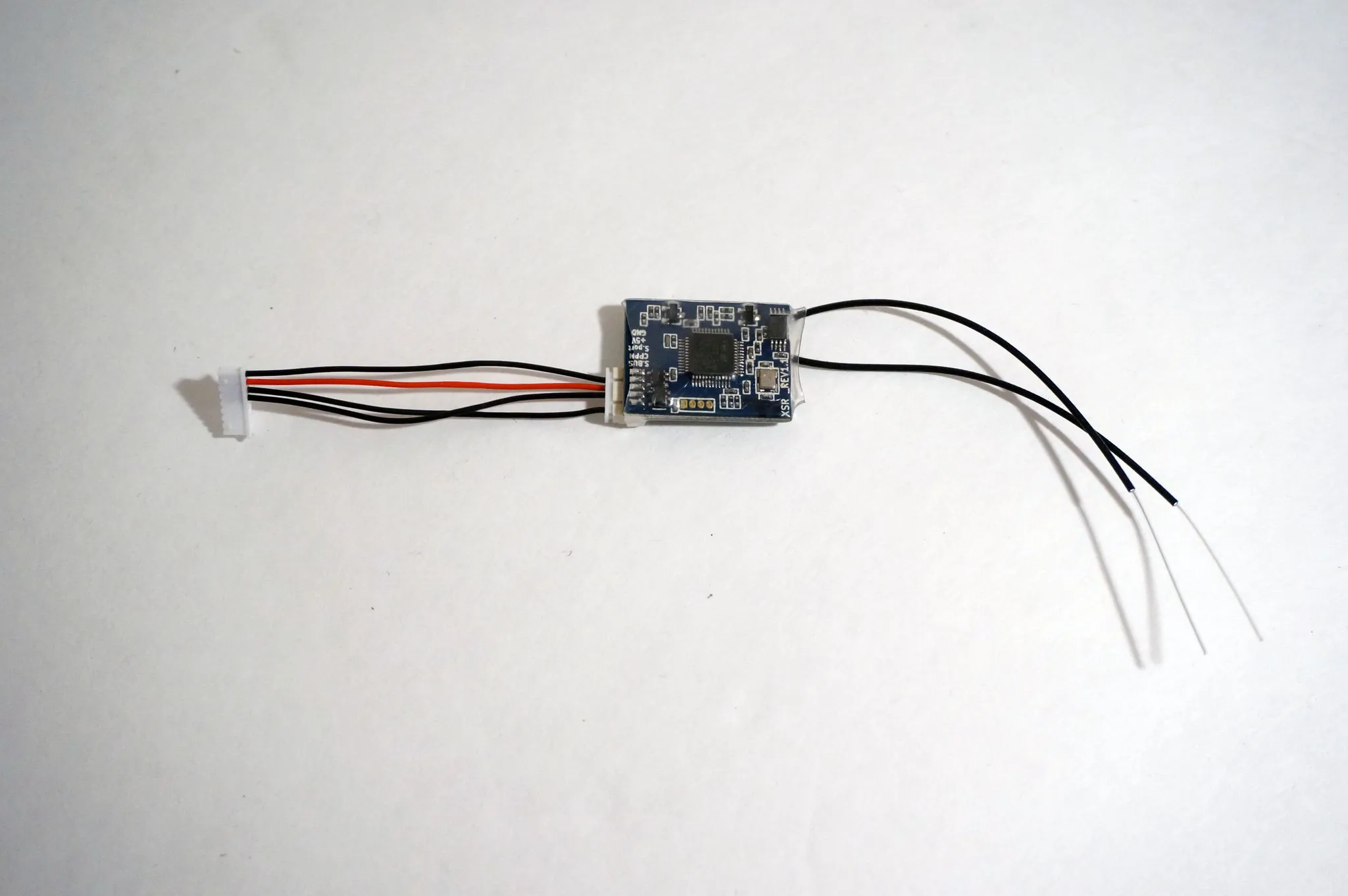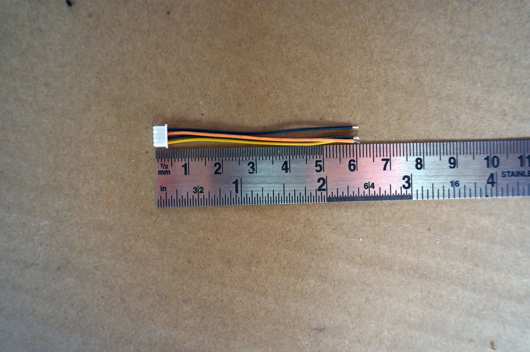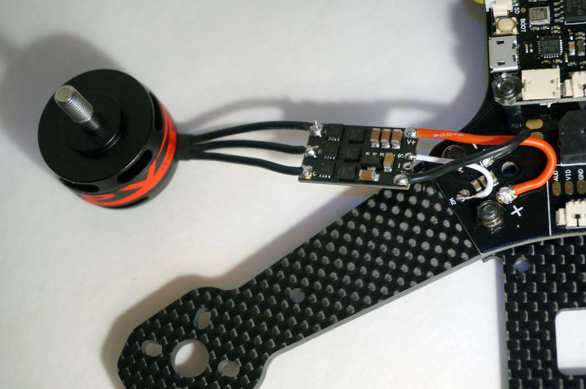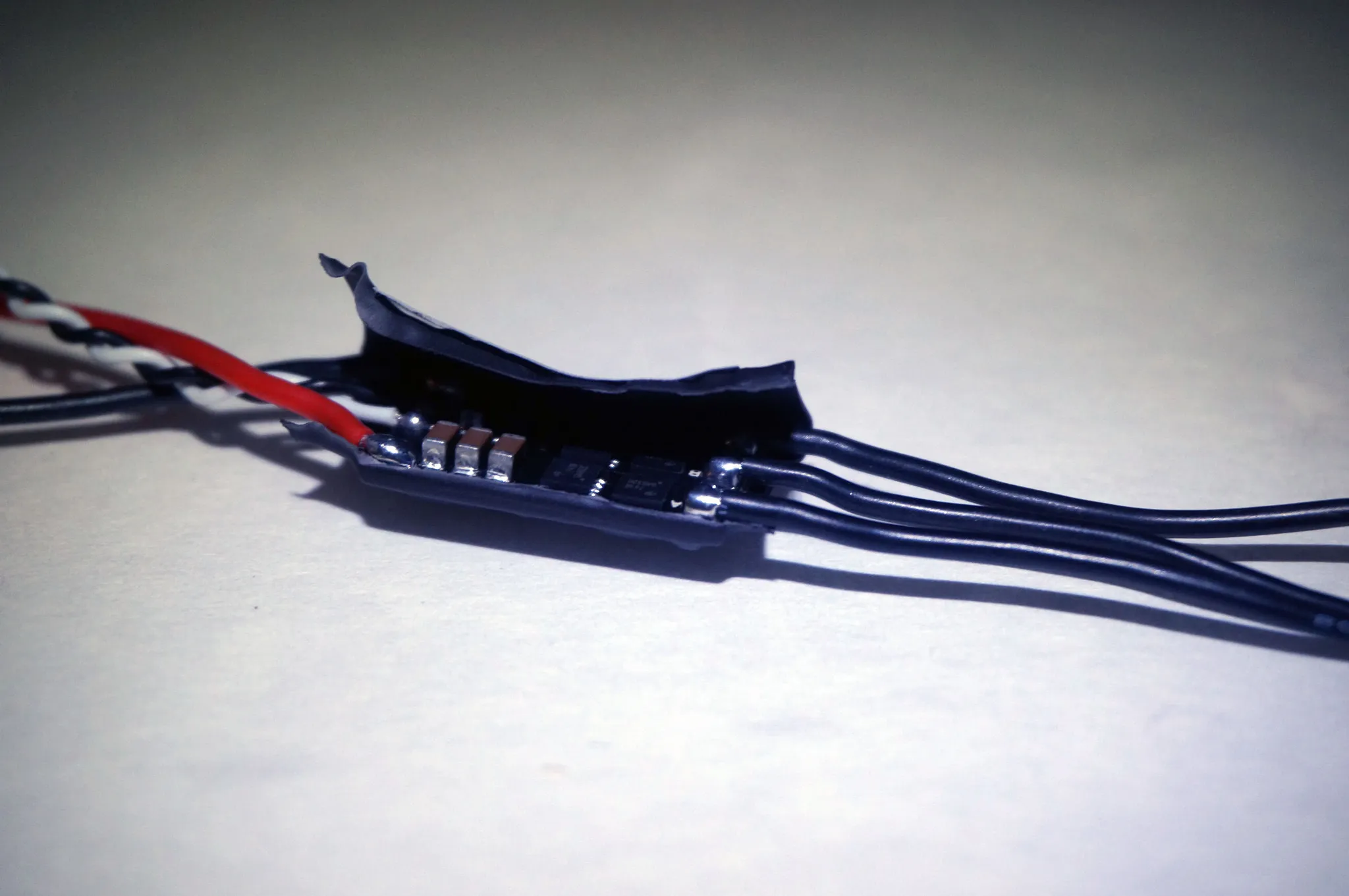 The first time I tried this, I trimed the power leads to 20mm and the signal lead to 10mm. This didn’t work so well, so instead trim to about 45mm and 25mm respectively. Notice the ESC on the left has much shorter leads: