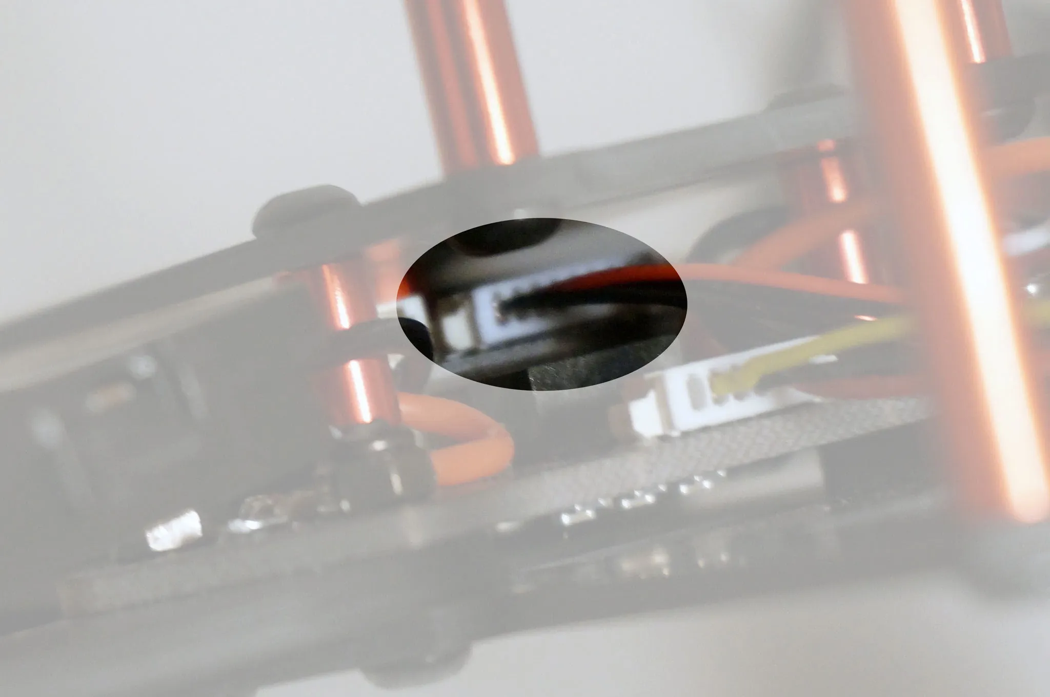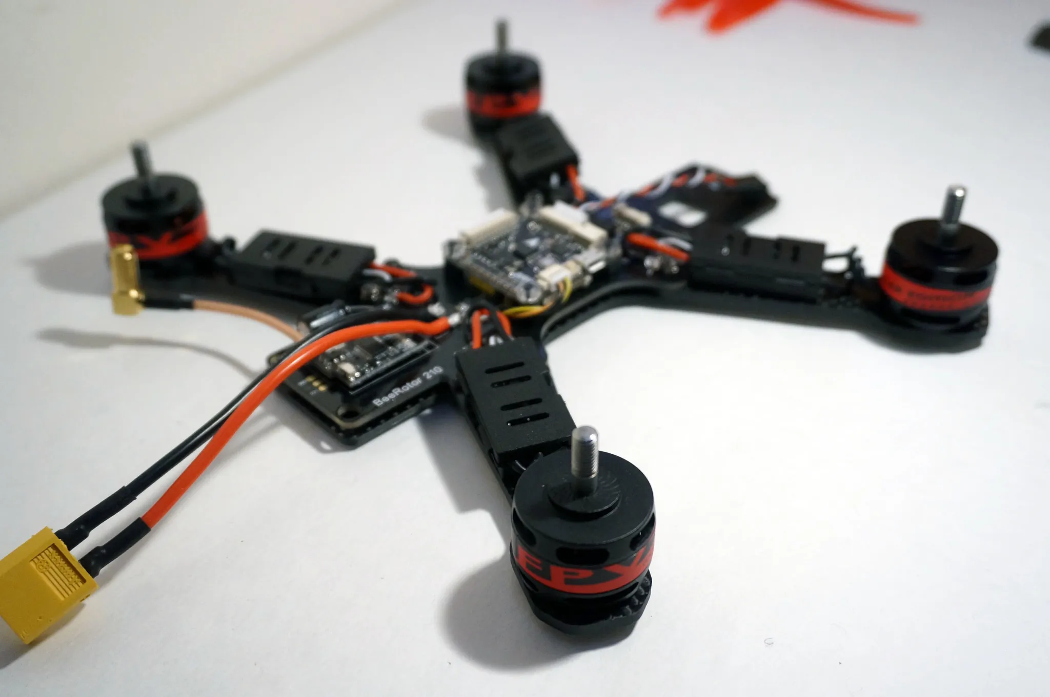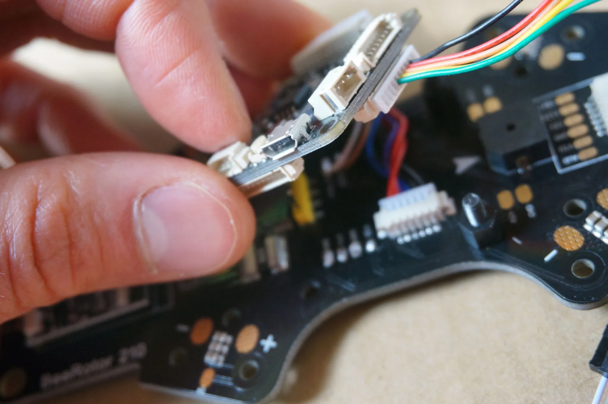 Now we can attached the BRF3 flight controller. Plug in all the connectors first.