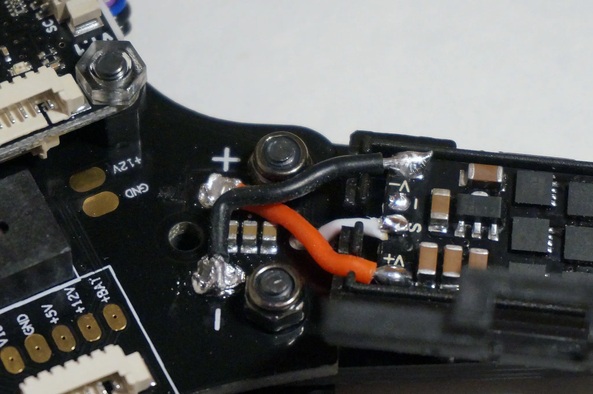 Tin the pads and leads, then solder the power and ground wires from the ESC onto the PDB. Make sure you solder the red to + and black to -. I had to turn my soldering iron all the way up for this, even then, I don’t think it was hot enough as the solder did not flow into a nice blob. It works, but isn’t super pretty.