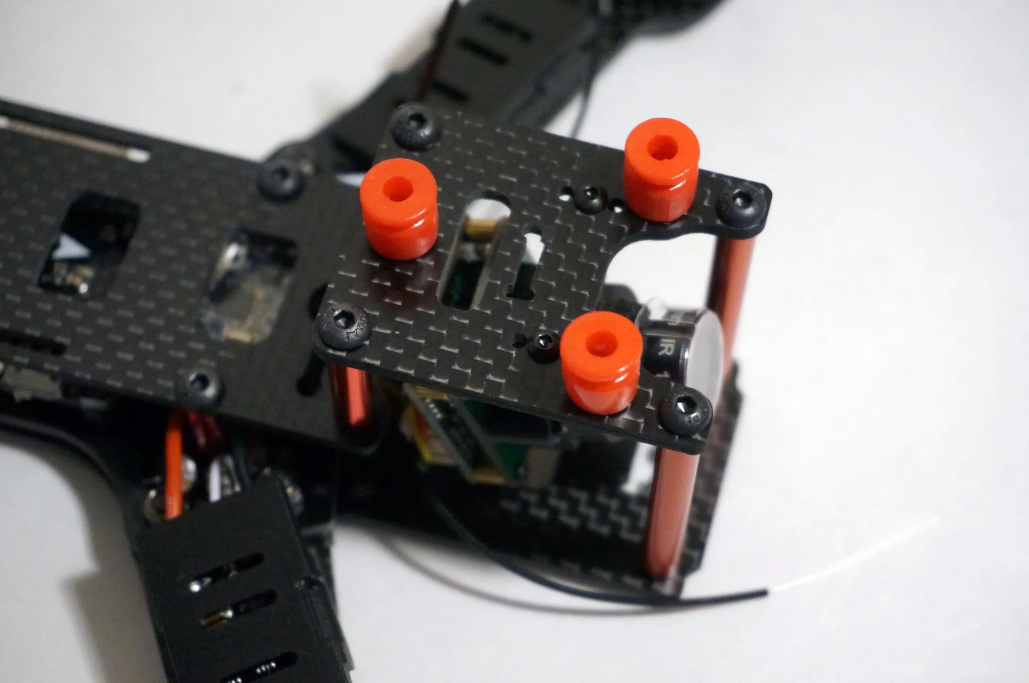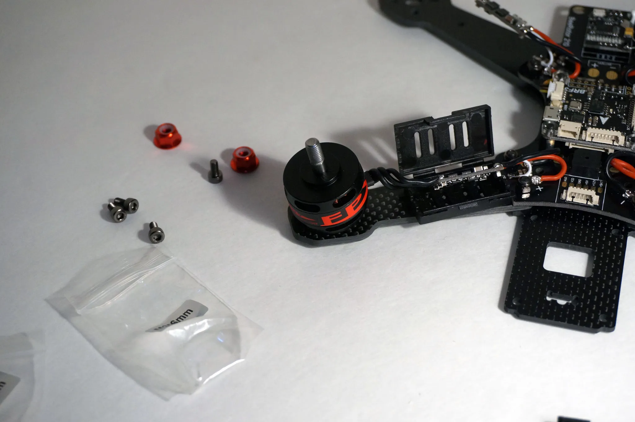We’re done soldering for now, so grab the included flight controller mounting hardware. Mine all came in a little bag: black plastic M35mm standoffs, M312mm bolts (the longer ones in the little bag) and clear nylon nuts.