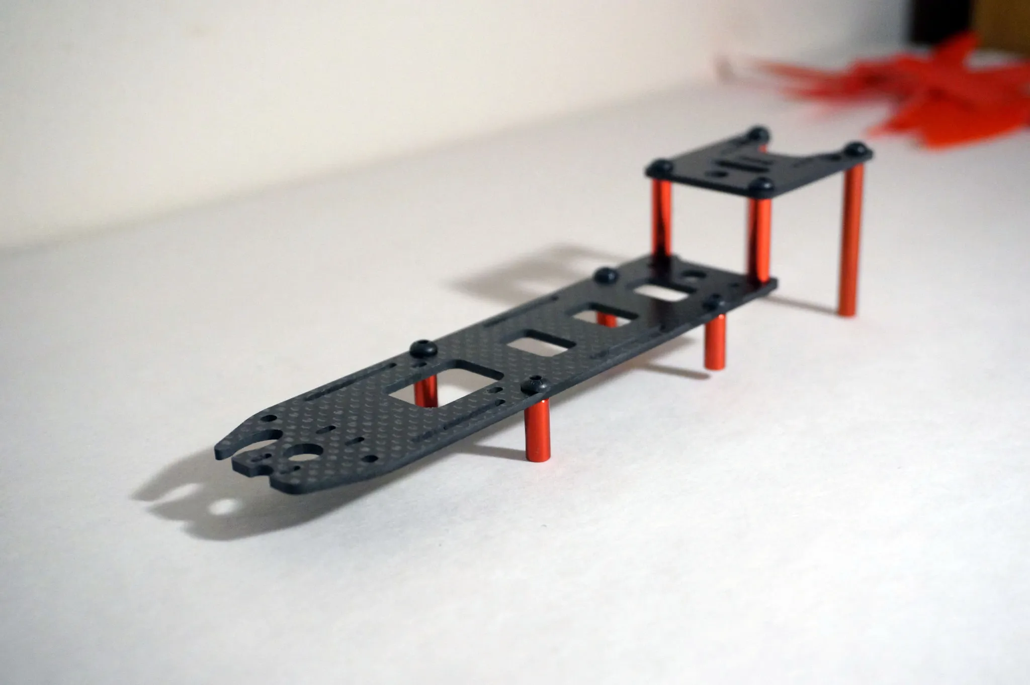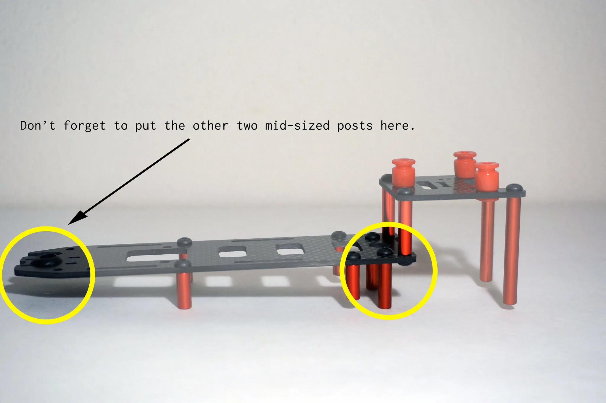 Let’s assemble the top plate next. Grab the top plate, the camera plate, the two longer standoffs, four mid-size standoffs, four short standoffs and 12 of the smallest, M3x5mm screws. Using locktight, screw everything into place. Don’t forget to install the two mid-size standoffs on the back, like I did :)