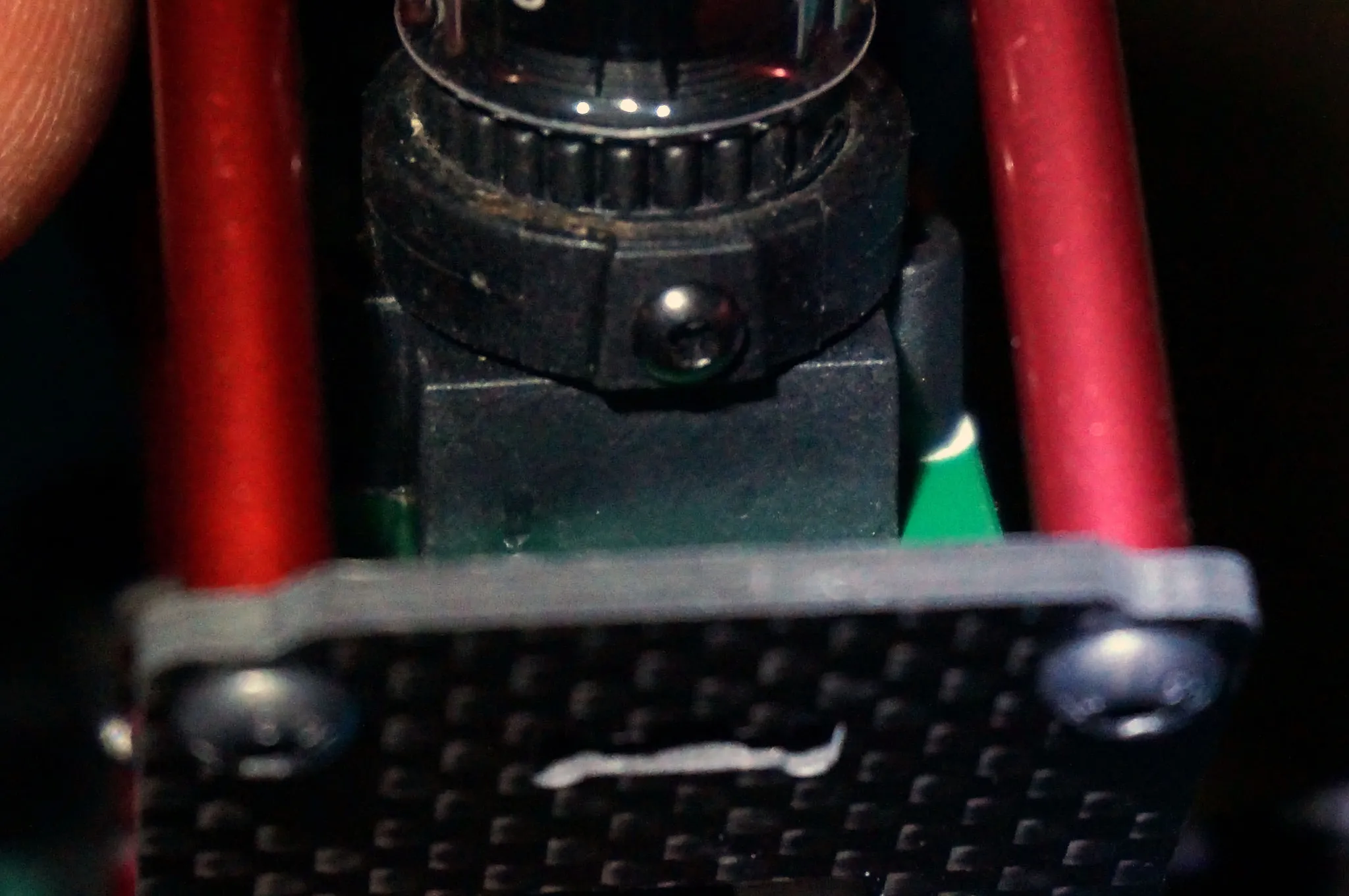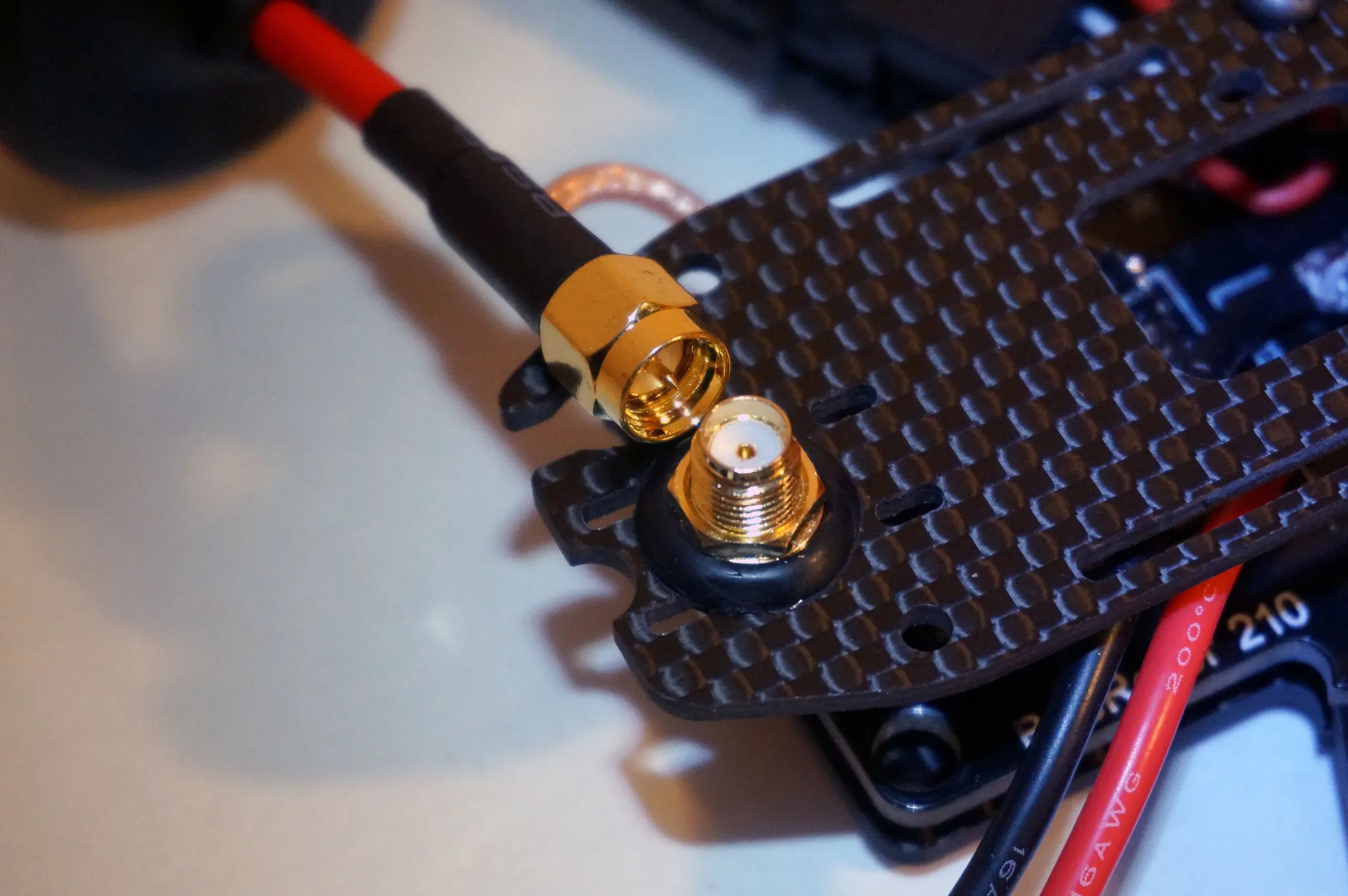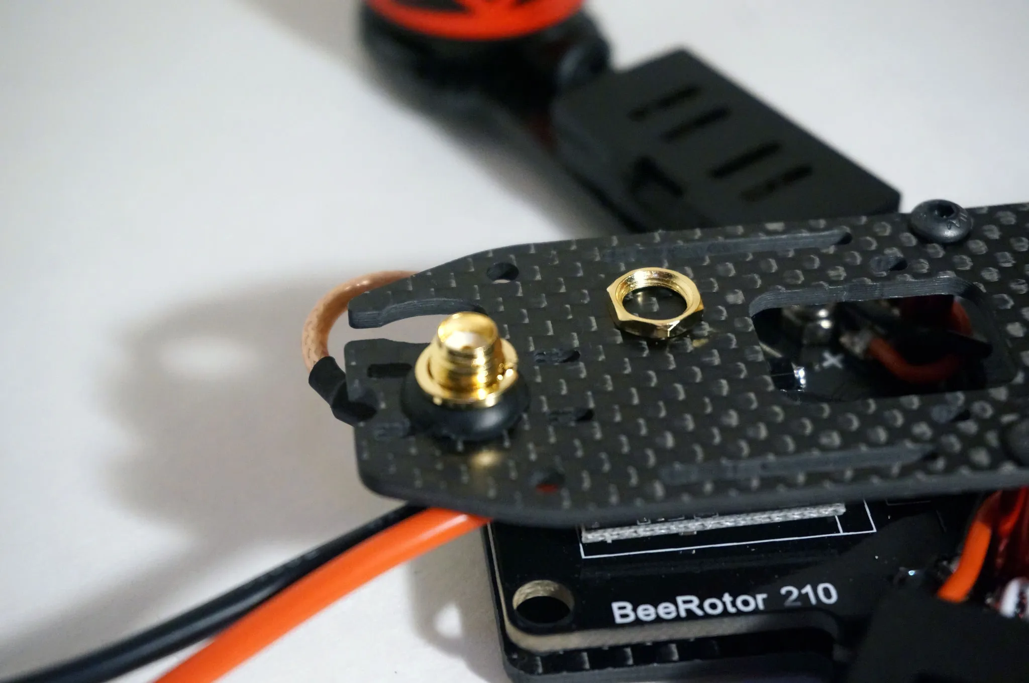 Install the little black rubber gasket in the VTX hole. Insert the VTX SMA adapter through the black rubber gasket. This isn’t easy. I had to push a pen through the hole first to open it up a bit, then shove the SMA adapter into the hole with the gasket then twist the plate to screw it onto the SMA adapter. Even though it’s a snug fit, don’t leave off the grommet! That would ground the carbon fiber frame to the video transmitter, which could wreak havoc on your video signal.