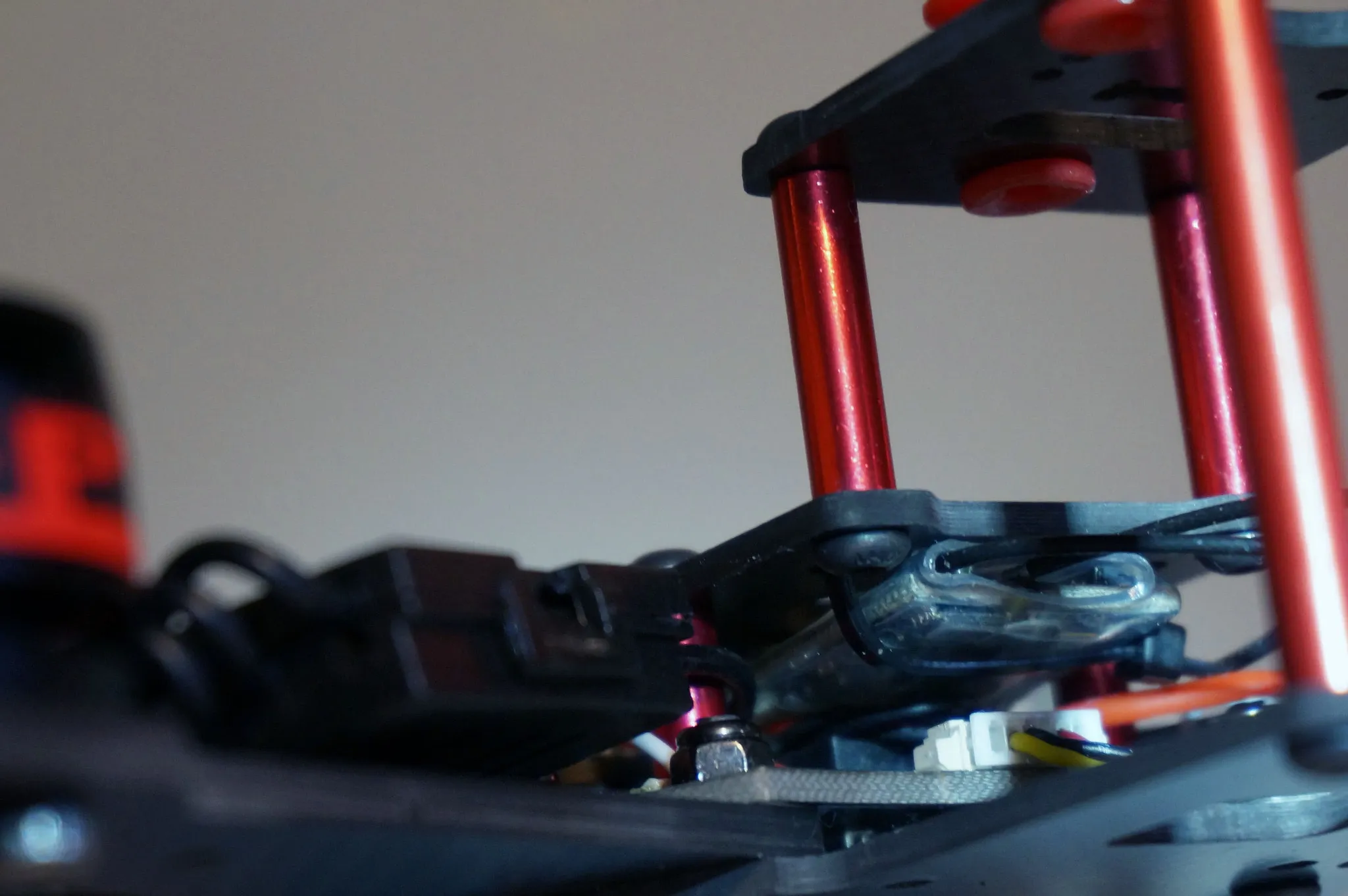Install the bolts through the bottom of the PDB and screw on the black standoffs. Don’t use any threadlock, since threadlock will melt plastic nuts and bolts! Tightening them with your fingers should be enough, since the second nuts we’re about to install will act like a locknut.