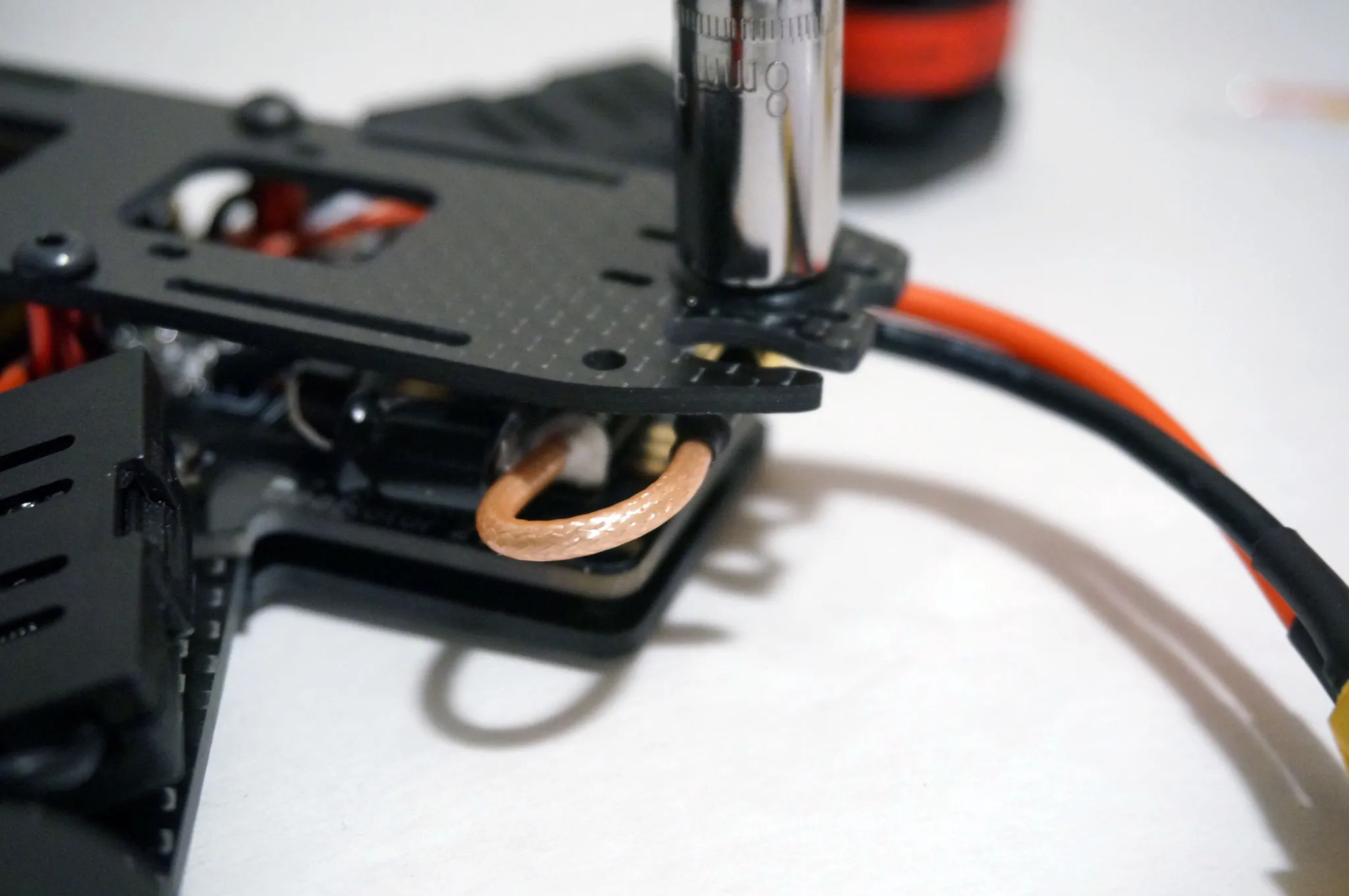I’ll show you how to mount the ESCs like the one on the right in the photo above, to give the most flexibility allowing you to move it towards the frame or towards the motor. This will allow you to easily add or remove the landing gear from the hole in the quadcopter arm, without removing the ESC or motor.