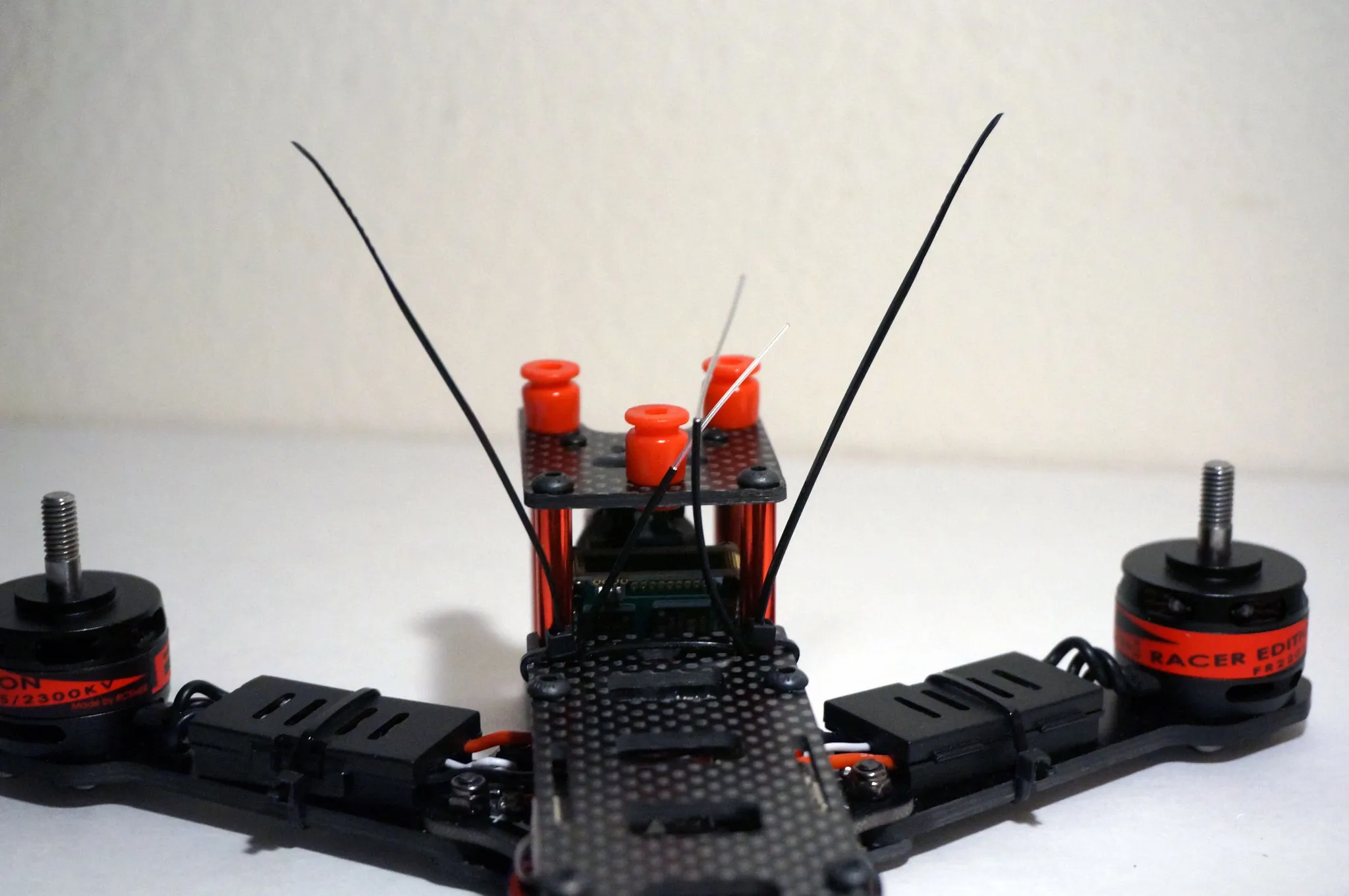I like to put some zip ties on the frame, ends pointing up. Then use some heat shrink tube to attach these to the receiver antennas: