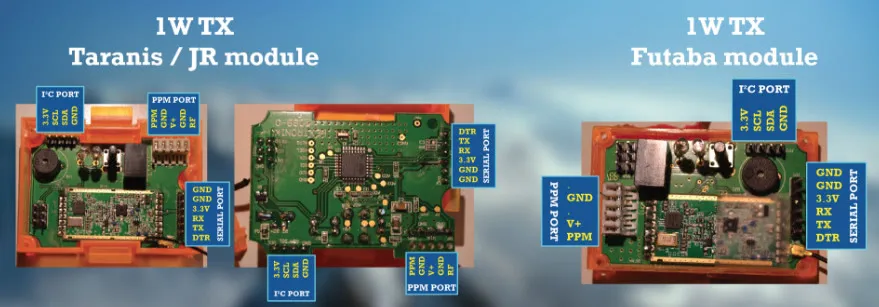 Here are the pinouts for the different OrangeLRS transmitter versions from this great guide.