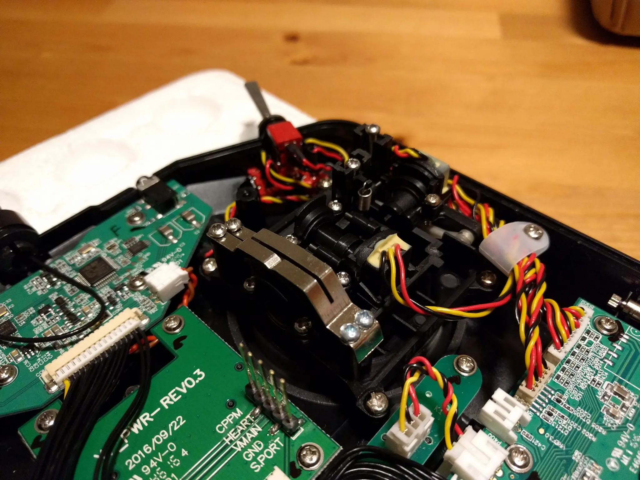Out of the box, both of my gimbal sticks are centered. If this is the case for you, you’ll need to open up your radio and adjust one of the gimbals. You’ll want to loosen the screw that is holding the spring taut, so it has as little friction as possible, then tighten the screw that holds the bar on the outside down, out of the way. Finally, tighten the screw on the clamp, either the smooth or clicky clamp, your choice.