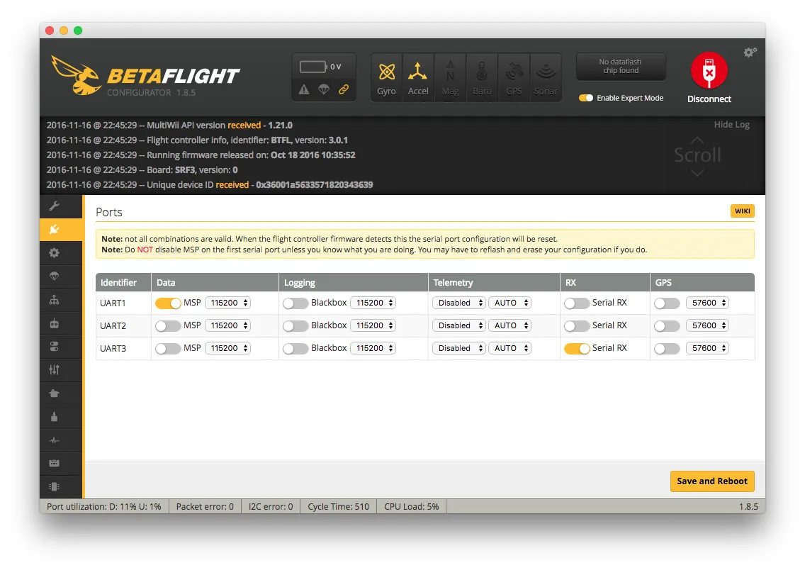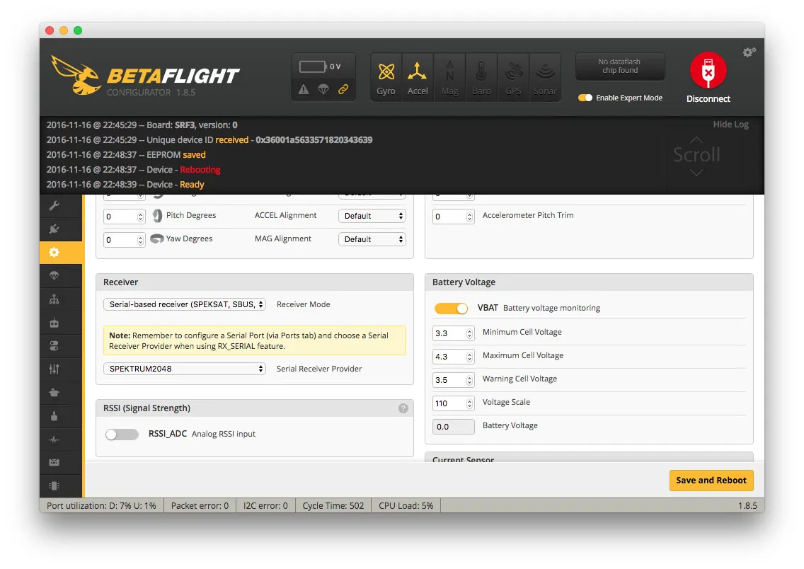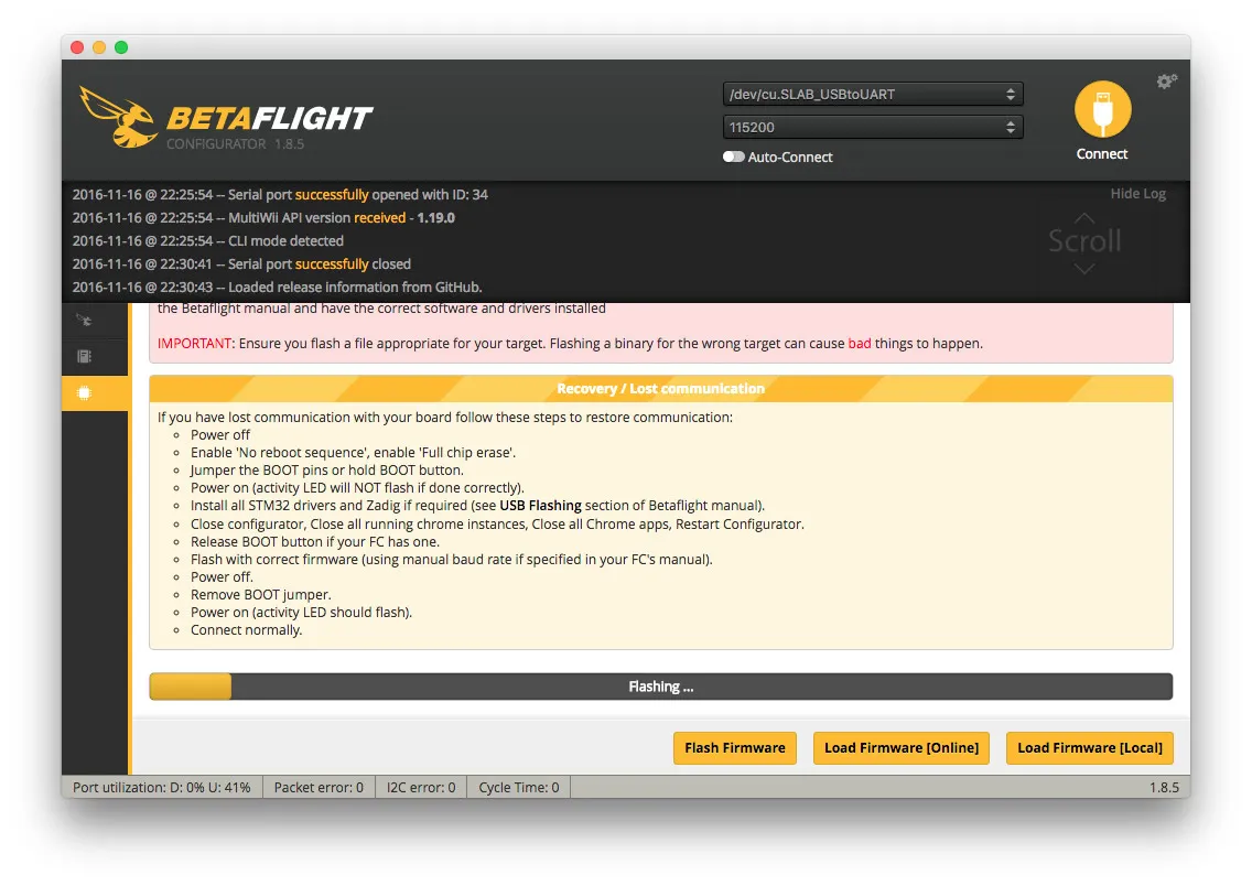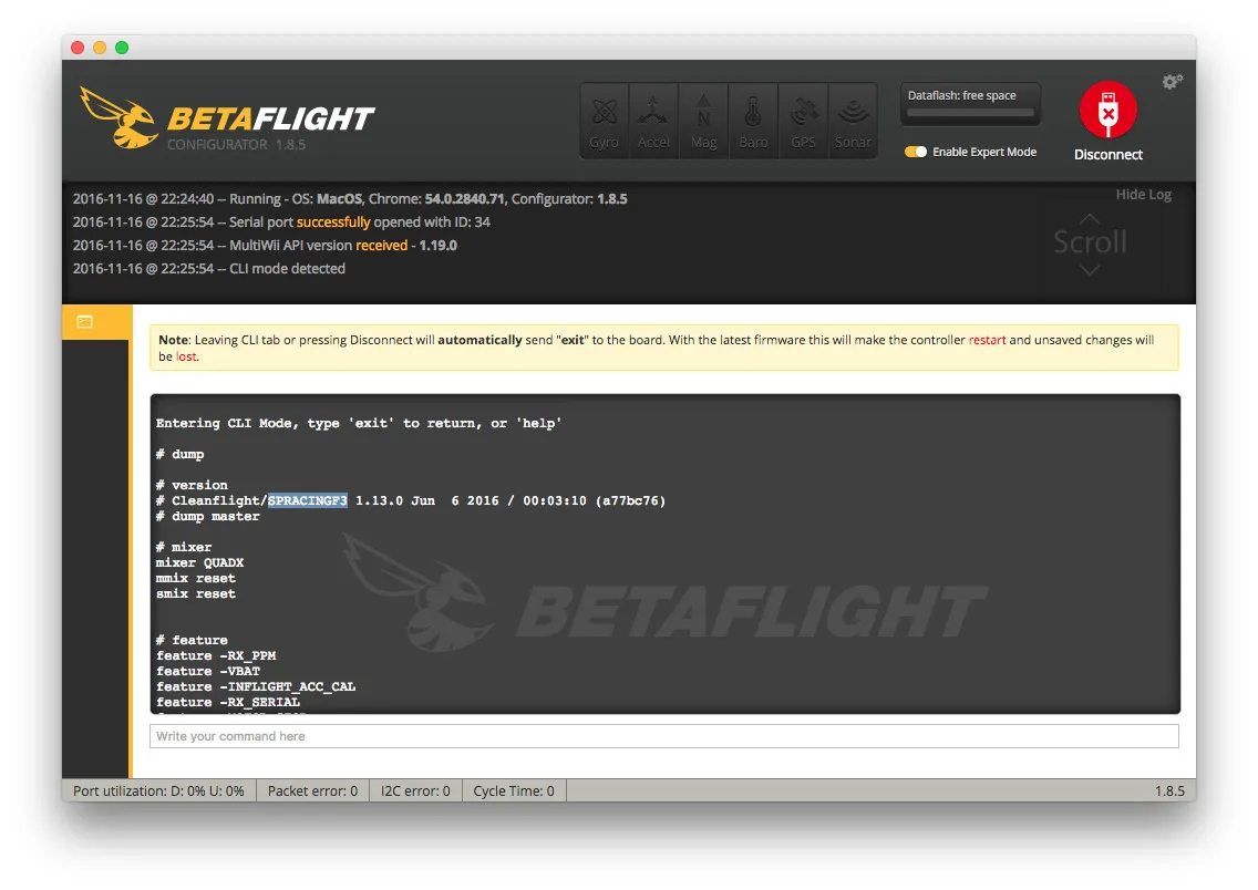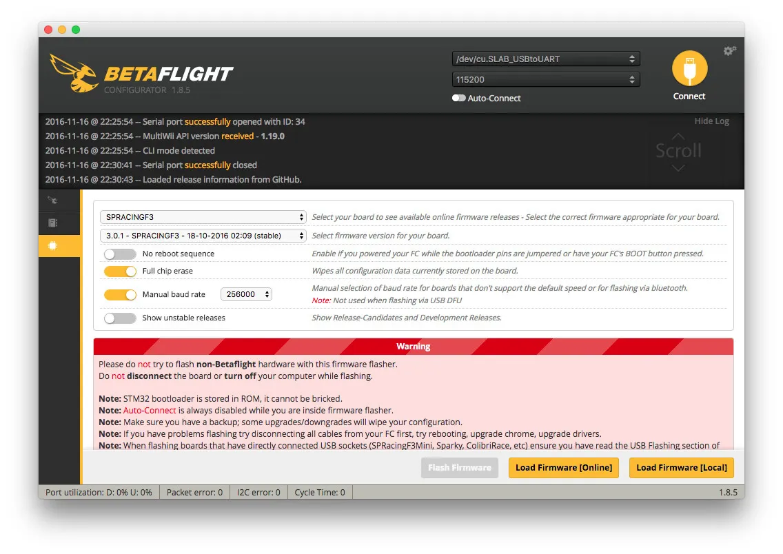 Connect it to BetaFlight and you’ll find it comes with an old version of CleanFlight installed. Don’t worry, we can fix that :)