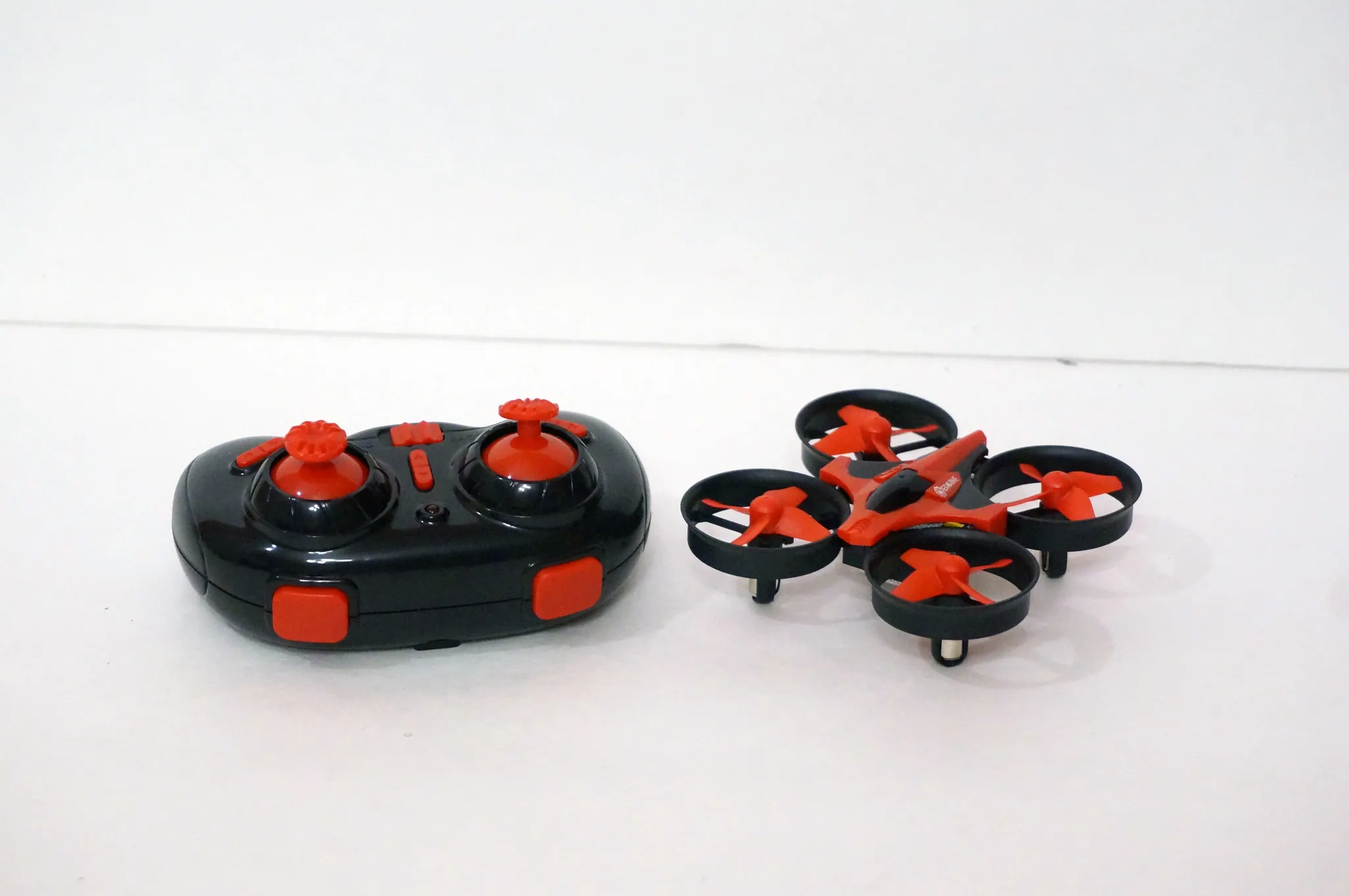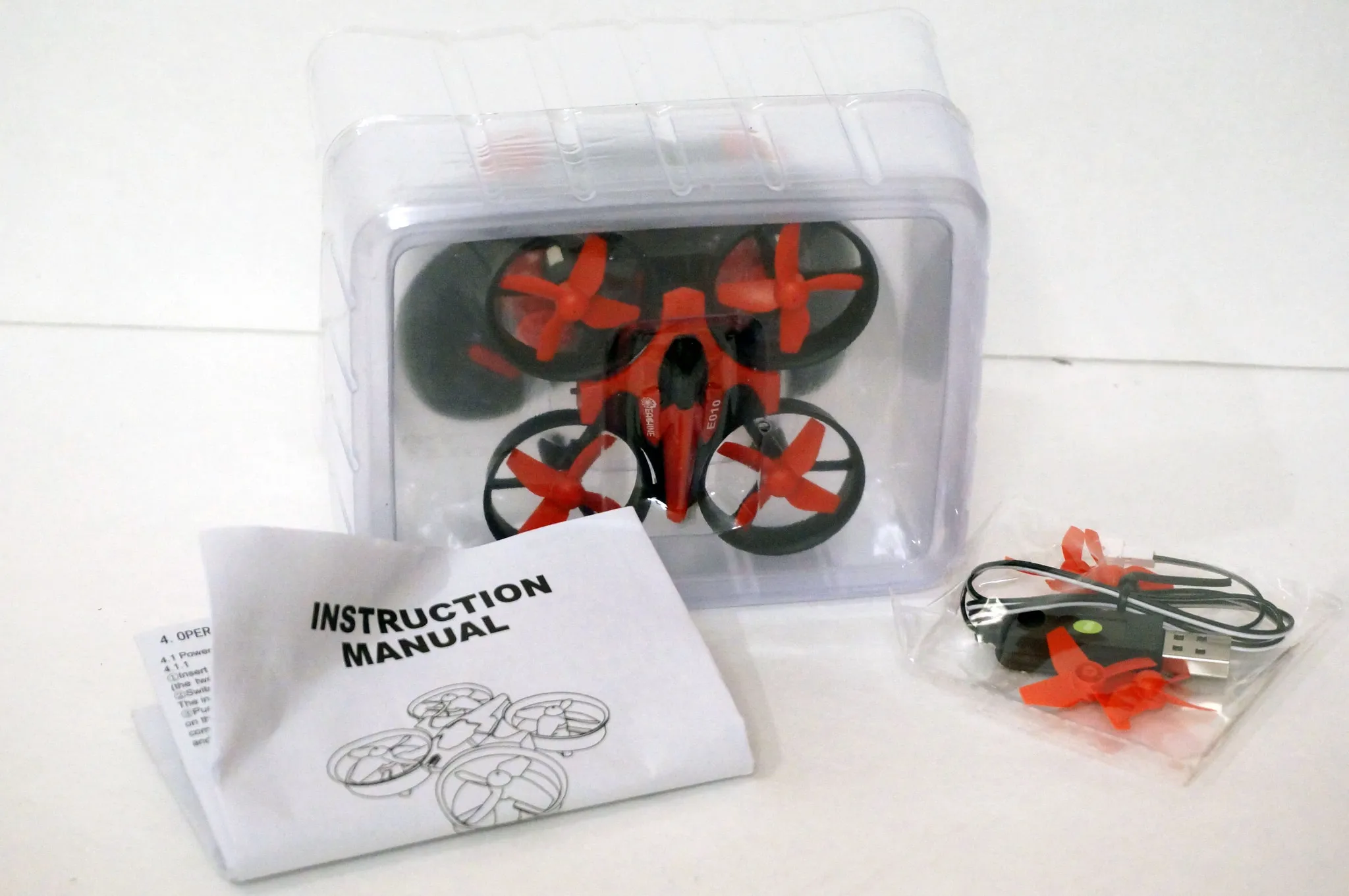 I really like that the E010 has ducted props, which act like big prop guards and that is ready to fly out of the box. The downsides are that this little quad does have acro mode and I only get about 30 seconds to 1 minute of flight time with the stock battery. Once the battery is dead, it won’t even lift off the ground.