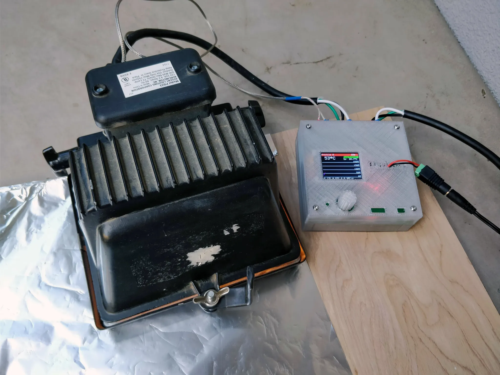 An integrated K-Type thermocouple-to-digital converter allows reading of a K-Type thermocouple temperature sensor. There are screw terminals for the thermocouple, which makes connecting it a breeze. Paired with the 12v power supply is a ~0.1A mosfet, which is enough for driving a small fan. The PCB footprint for this mosfet is suitable for mounting a much higher amperage device, in case you need to control something that draws more current. Prototype boards have a mosfet that can drive much larger currents, however these devices were quite expensive relative to the total cost of the board, so lower current devices will be used in product.